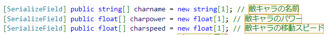 敵キャラクターの名前、衝突時のHP処理に使用する攻撃力、移動スピードのパラメータをそれぞれの配列名の同じ番地に格納することでパラメータを管理しています。