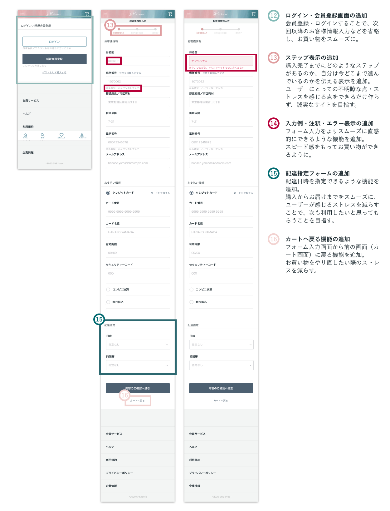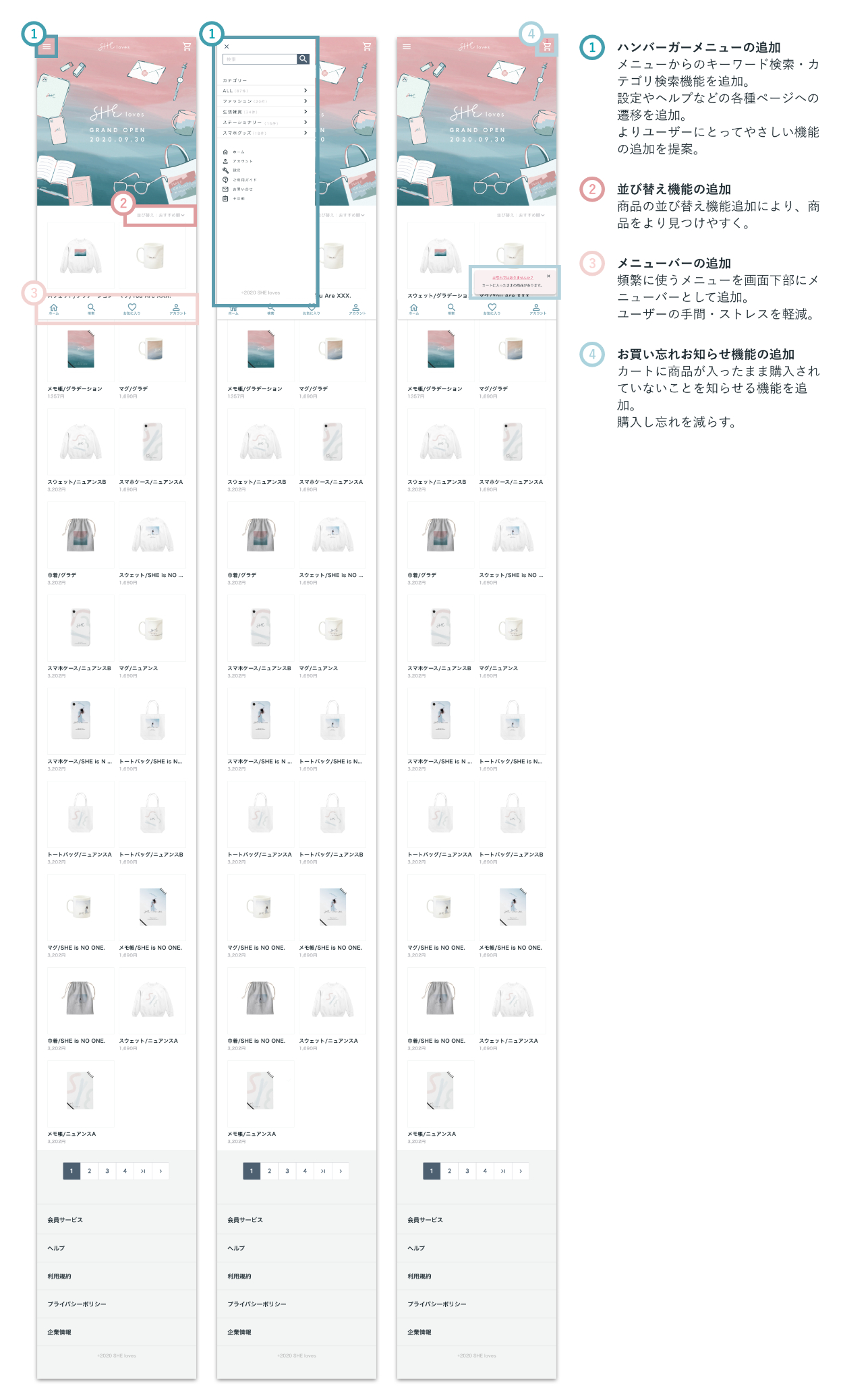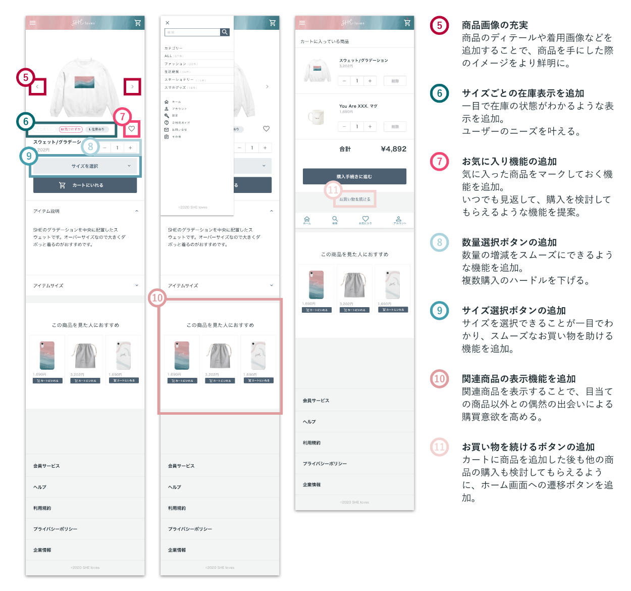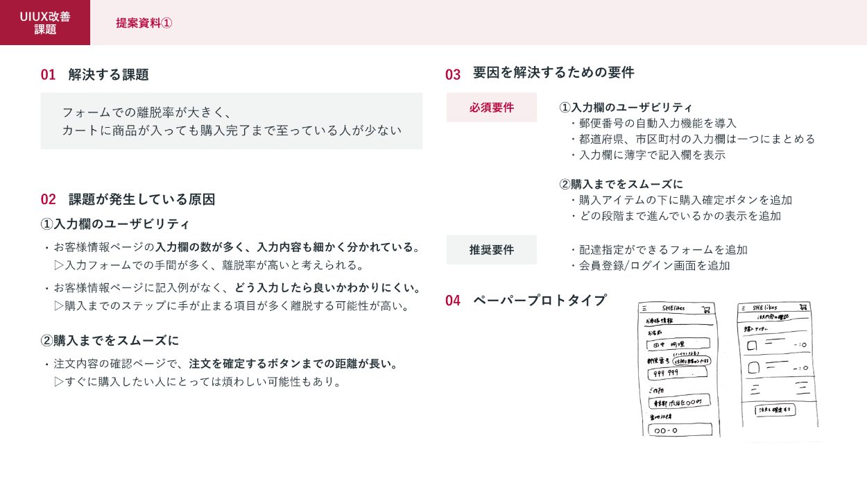 依頼内容:SHEのグランド展開としてECサイトを運営し始め、さらに売り上げを伸ばすためにUI/UX改善に取り組みたいと思っている。今感じている課題感を共有するため解決案を提案して欲しい。