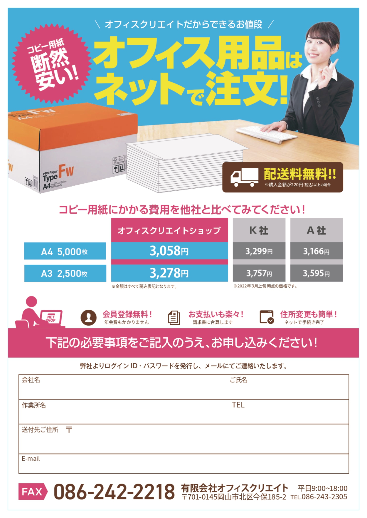 オフィス用品の代理店ショップ開設にあたり、すでにコピー機をご使用されている既存客 向けに、申込みチラシを制作。フラットデザインで、表の配色、アイコンを使用し、ぱっとひと目で見て、わかりやすいデザインを心がけて制作。