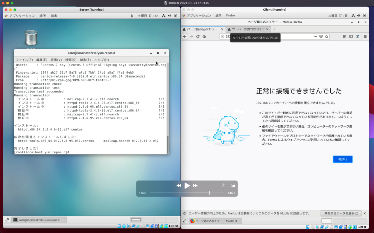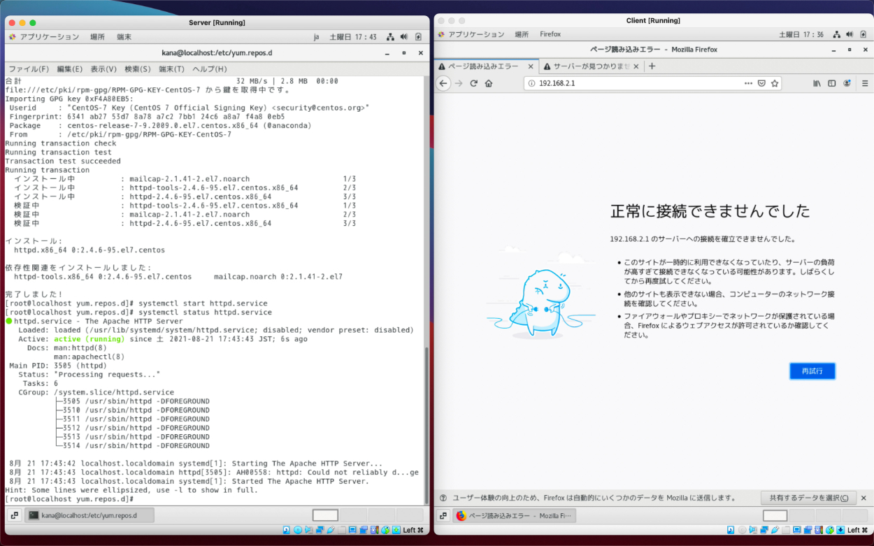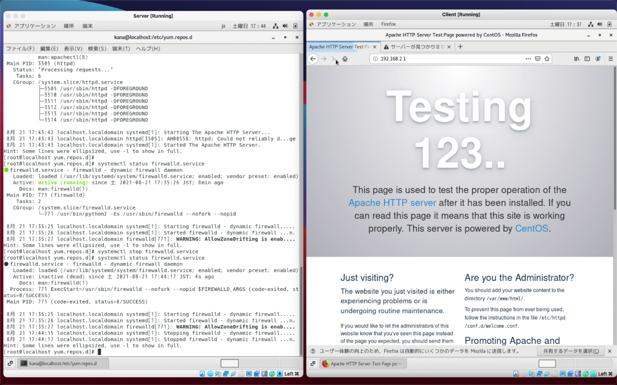 Client機の更新ボタンをクリックしアパッチテストページが表示されることを確認します