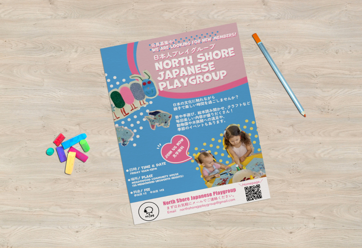 コンセプト:新規会員様募集のチラシ。お子様(幼児〜就学前)の方のプレイグループのため、「虹」&ポップで楽しいイメージのチラシ制作をご希望とのことで、虹やお子様のクラフト作品などを取り入れ、制作いたしました。