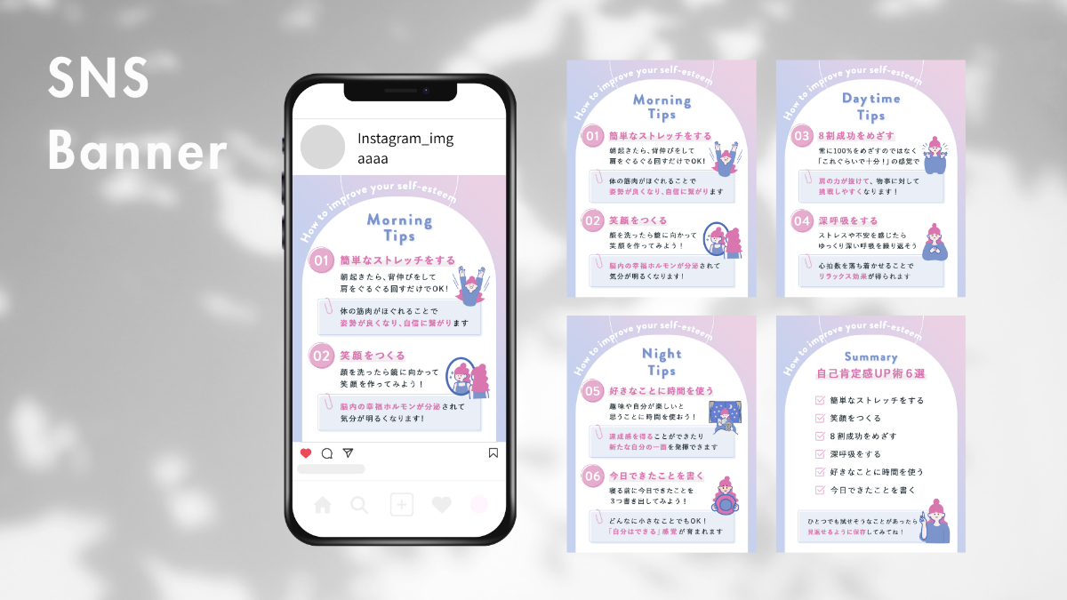 ・背景はクライアントから指定された配色を使用して、自己肯定感UPをイメージした右肩上がりに上がるような、徐々に明るくなるグラデーションの配色にしました。