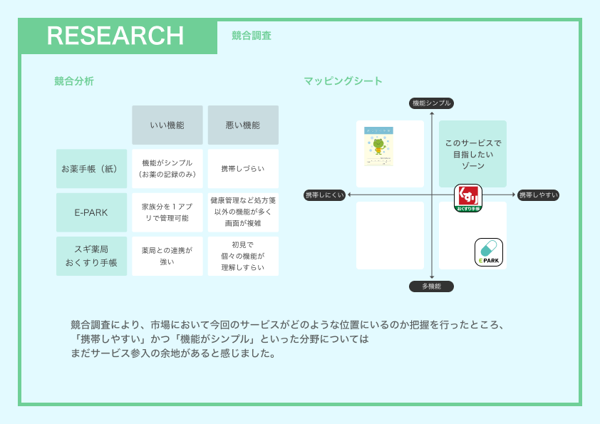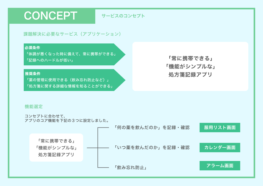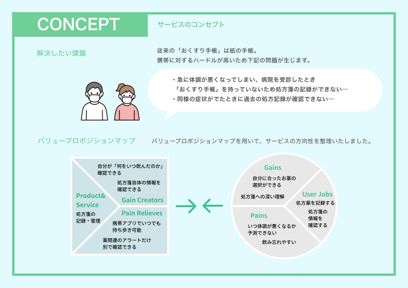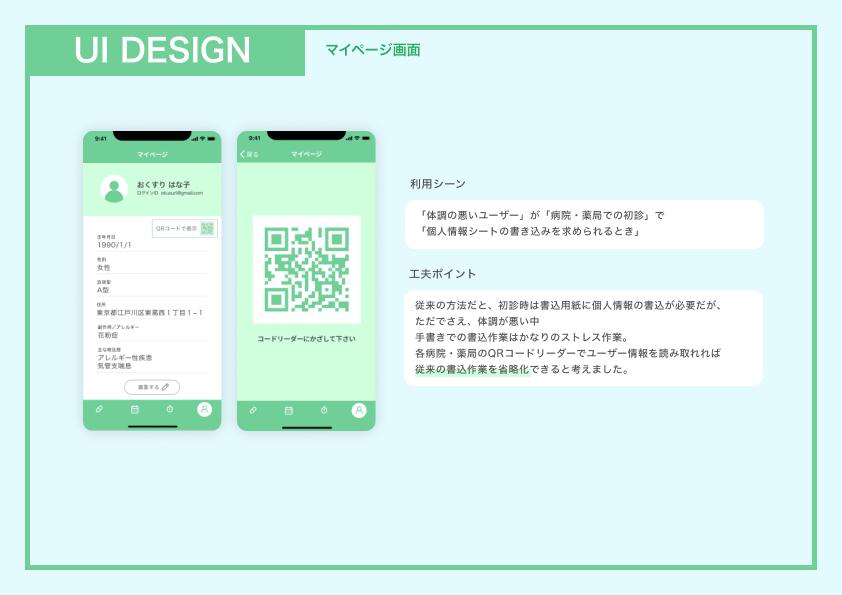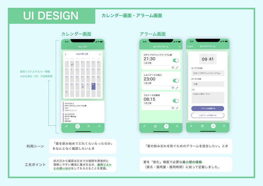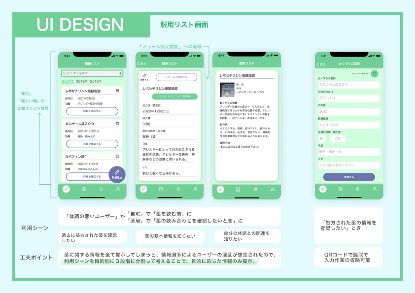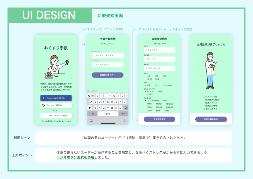 「おくすり手帳アプリ」という架空サービスのアプリ画面を作成しました。