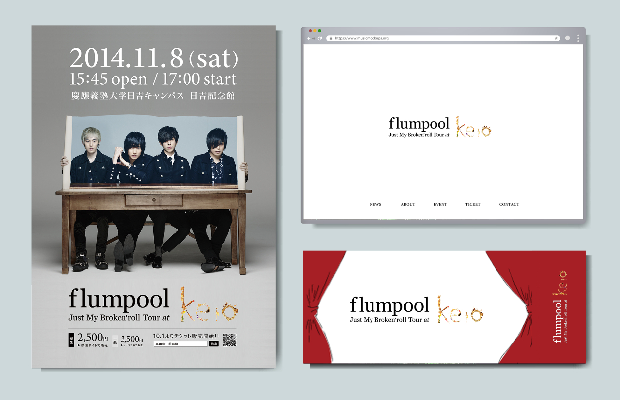 flumpoolさんの "Just My Broken'roll Tour" の1公演として行われた慶應義塾大学学園祭ライブのロゴ、ポスター、チケットなどをデザインさせていただきました。