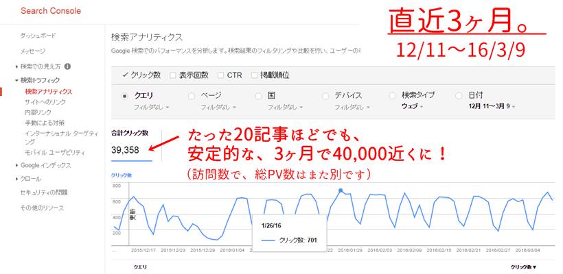 なお、2016年の直近3ヶ月では、40,000クリック数と安定的な集客を誇るサイトとなりました。