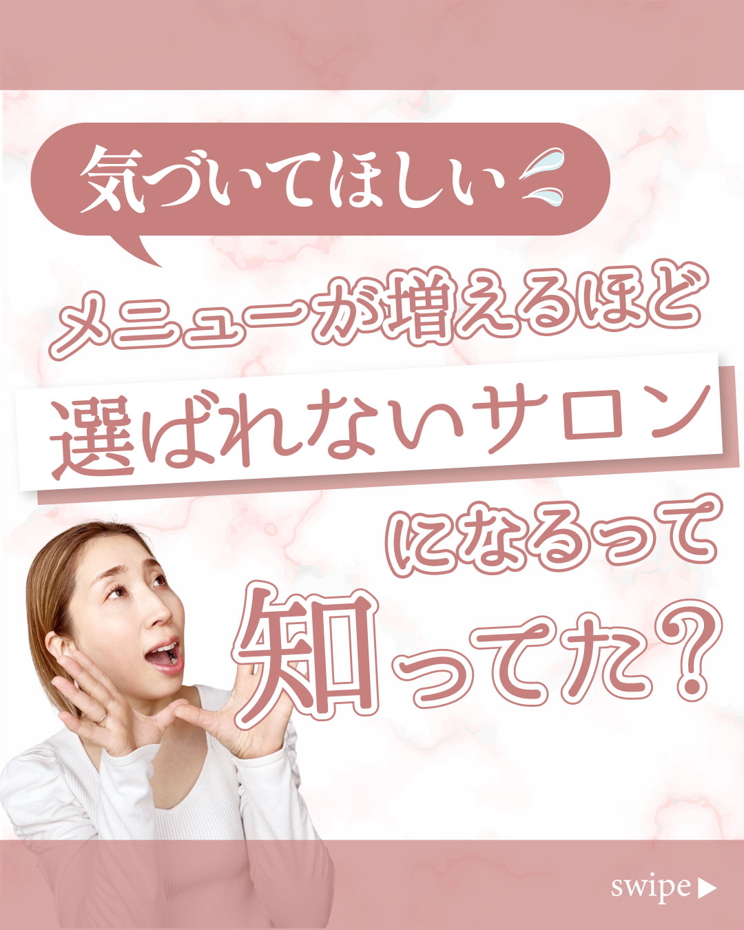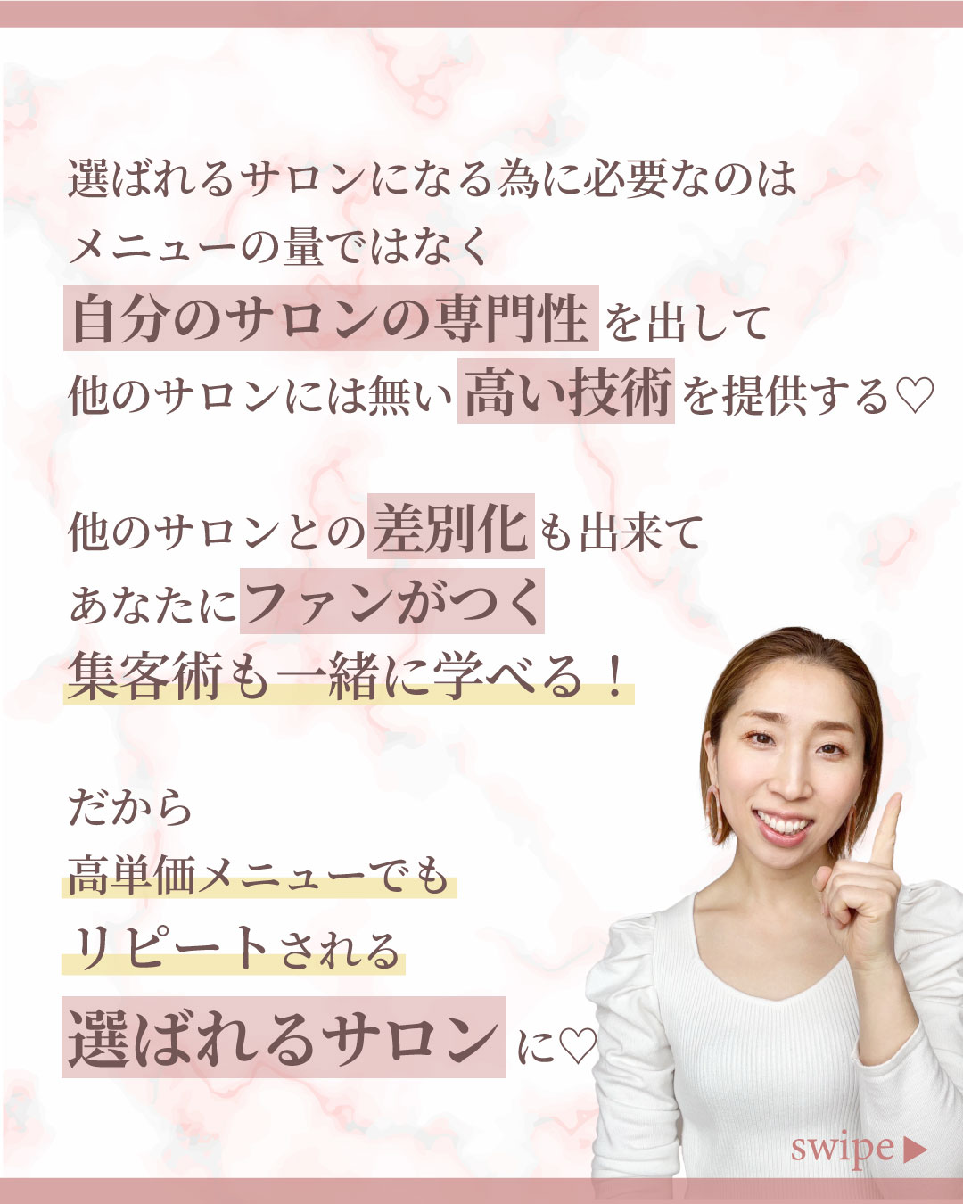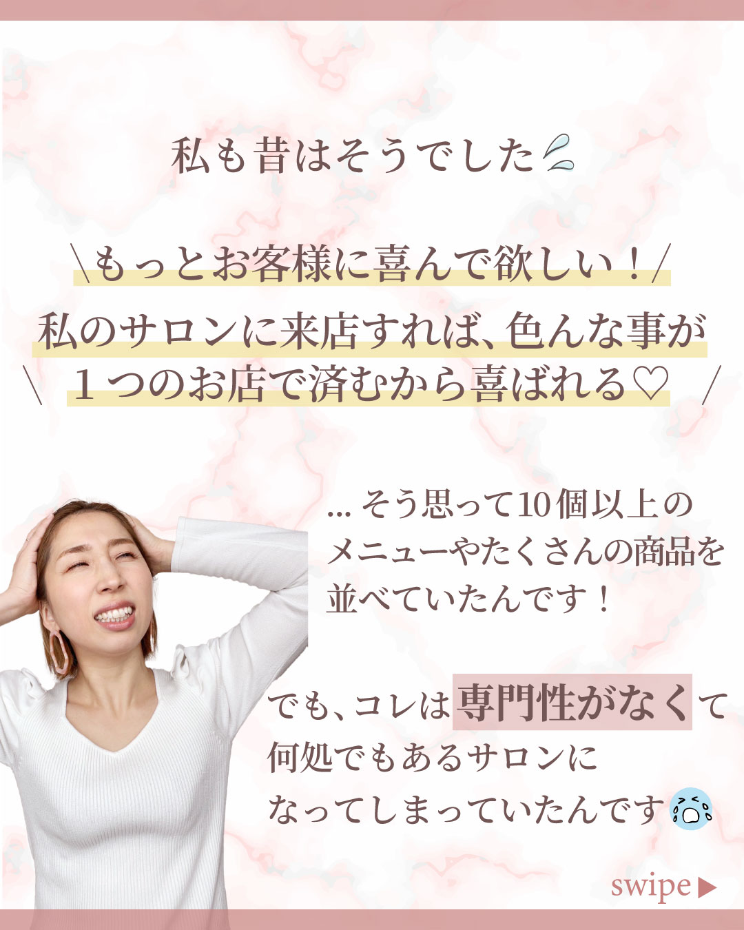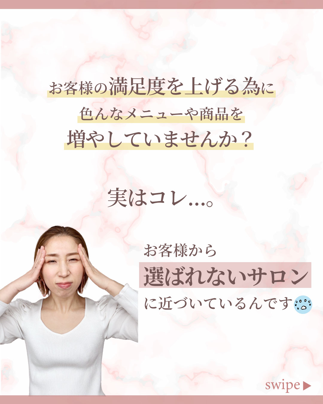 クライアント様の柔らかい優しい雰囲気をイメージして、背景にピンクの大理石の素材を使用して、上品で柔らかい雰囲気を表現しました。クライアント様が提供してくださったお写真がとても印象的だったので、各ページに使用し、共感を得やすいデザインにしました。