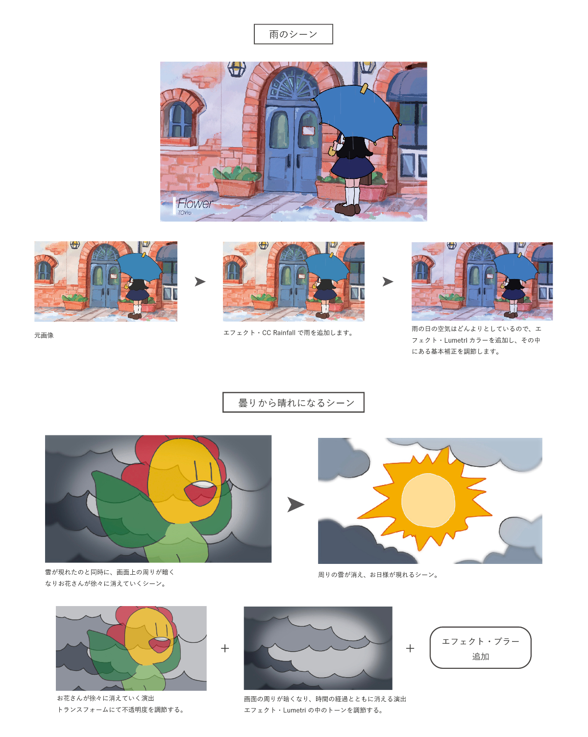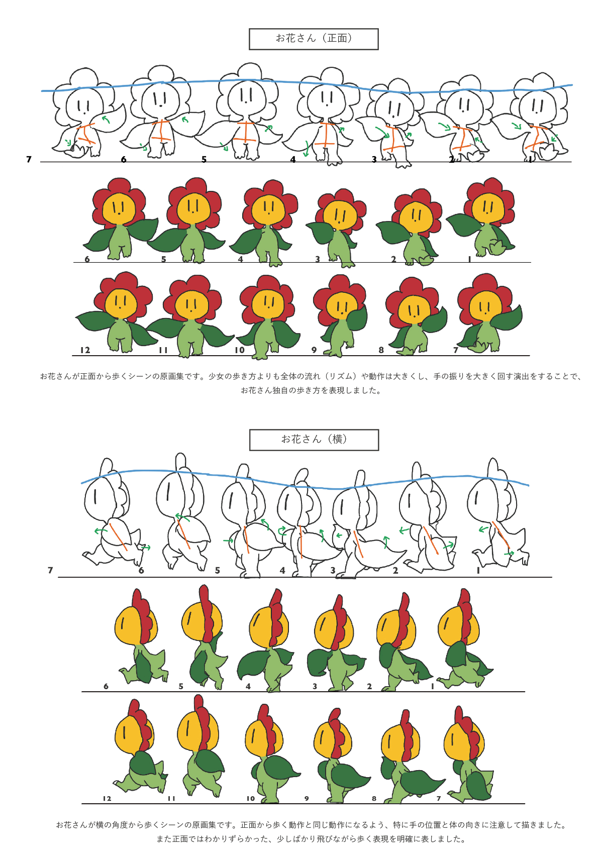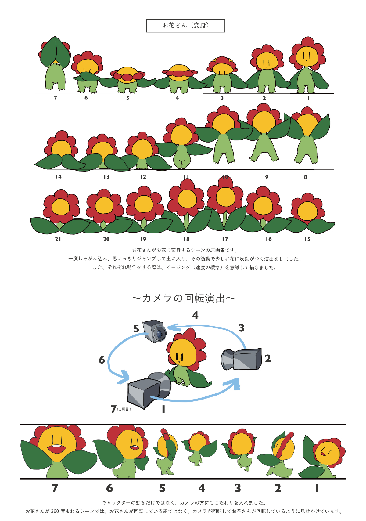 アニメーションを作る上でもっとも考察した工程です。視聴者にわかりやすく動画内容を伝える為に何度も描き直したり、カットごとに色んな表現方法ができるよう工夫をしました。作る際に苦労したところは、お花さんが少女に伝えたいことをどう表現し、それをどのタイミングで組み込むかという事です。