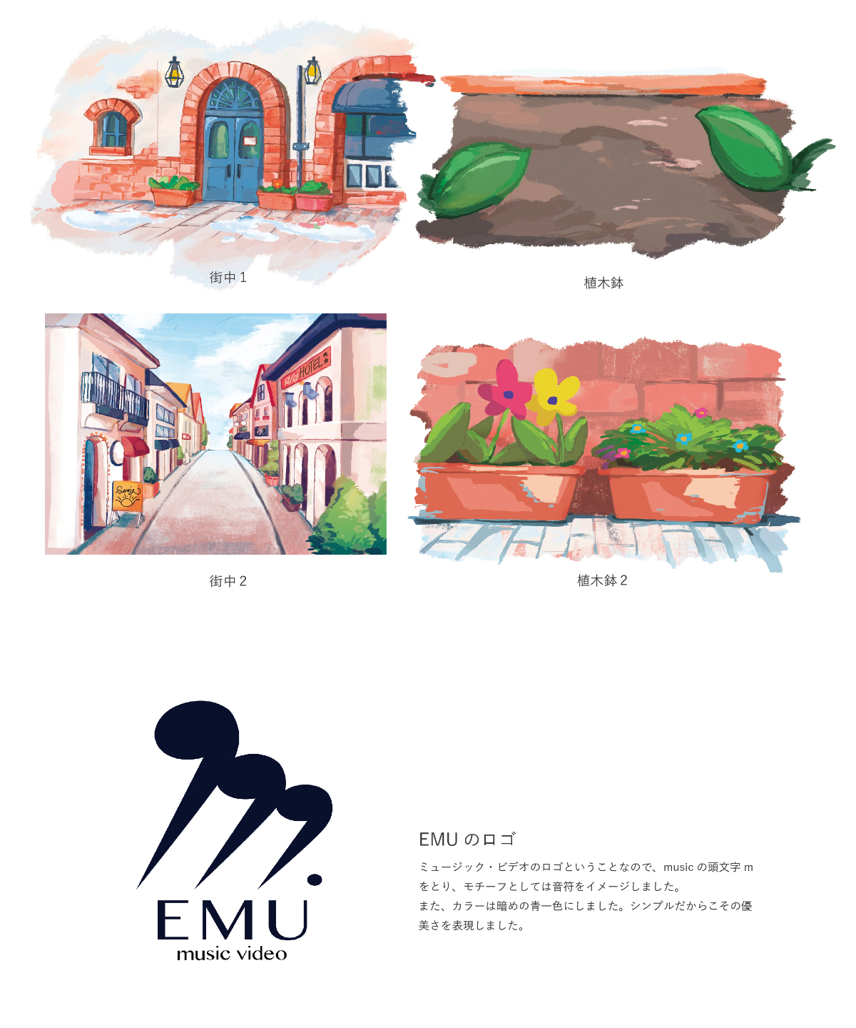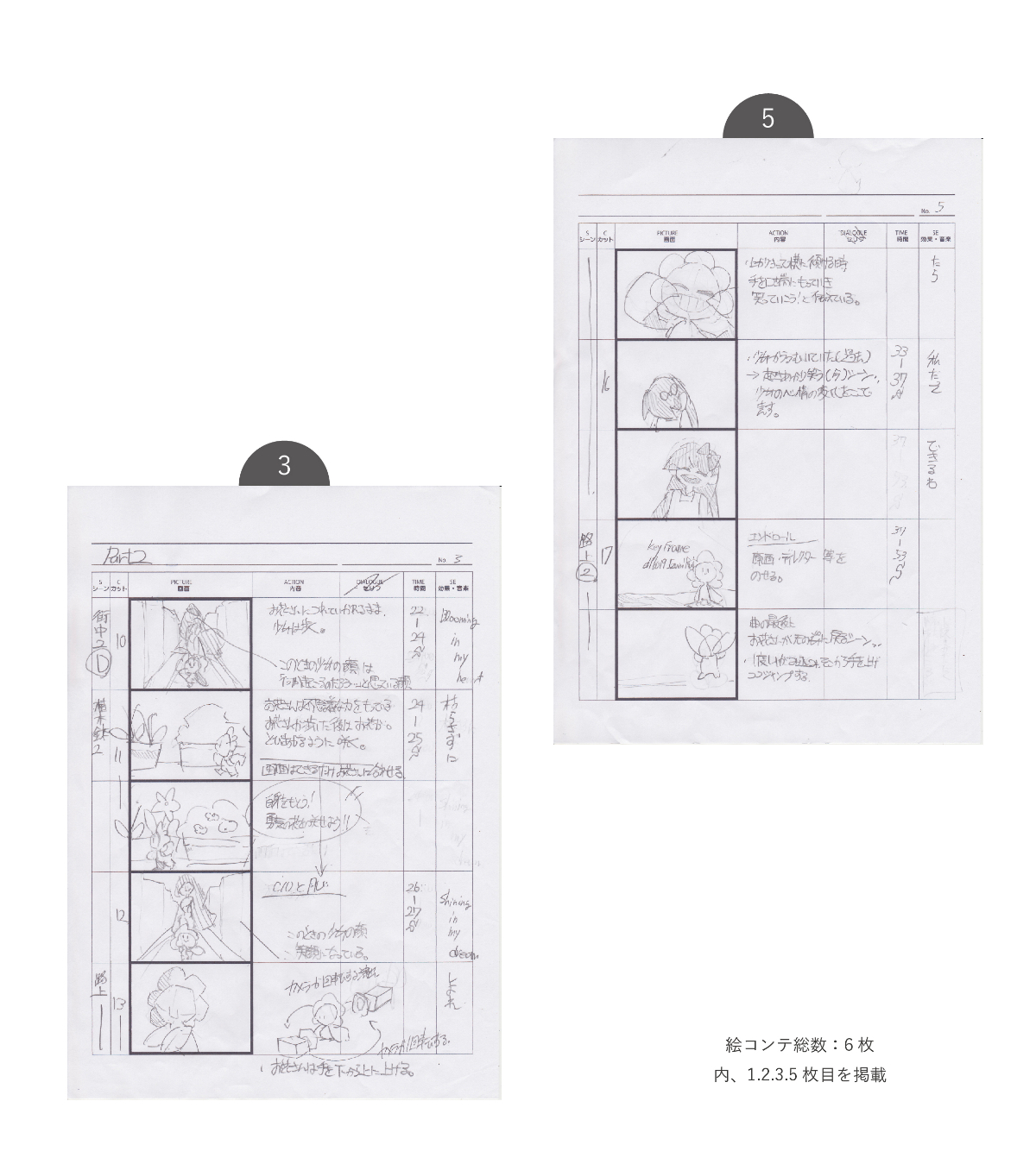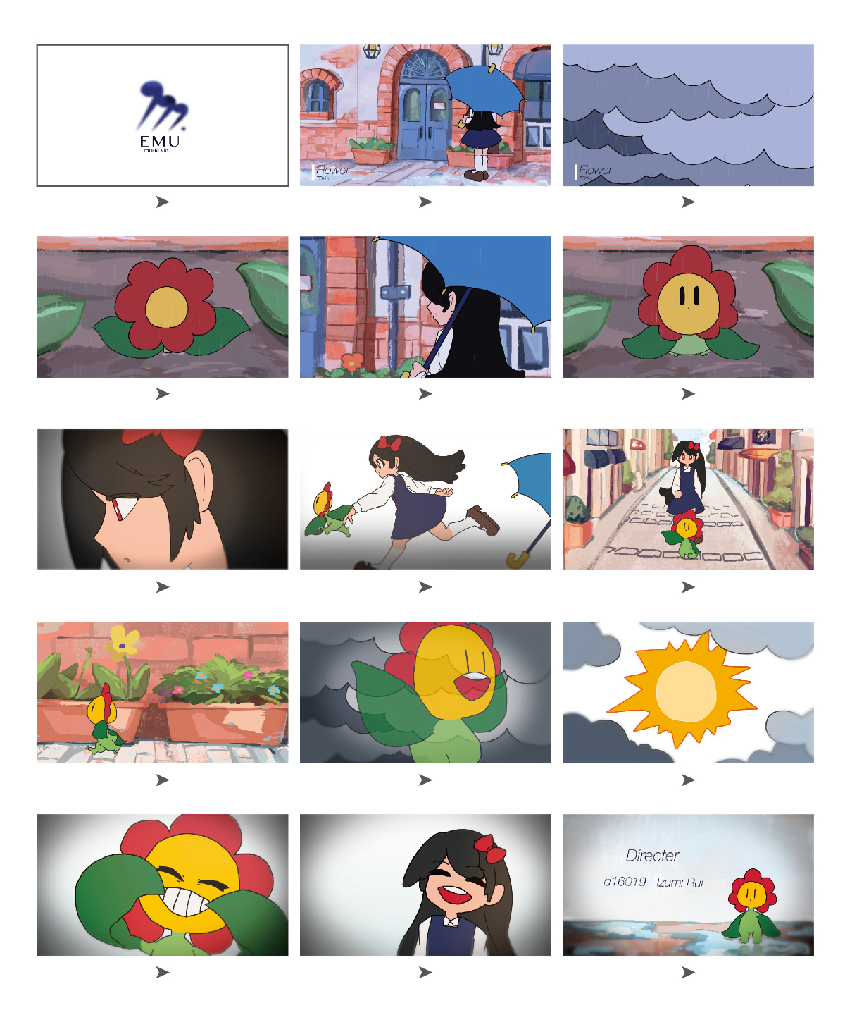 アニメーションを作る上でもっとも考察した工程です。視聴者にわかりやすく動画内容を伝える為に何度も描き直したり、カットごとに色んな表現方法ができるよう工夫をしました。作る際に苦労したところは、お花さんが少女に伝えたいことをどう表現し、それをどのタイミングで組み込むかという事です。