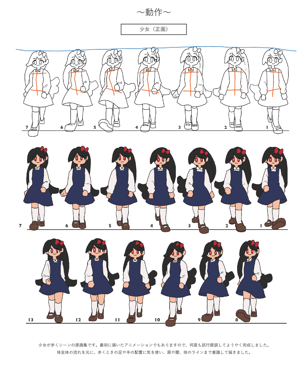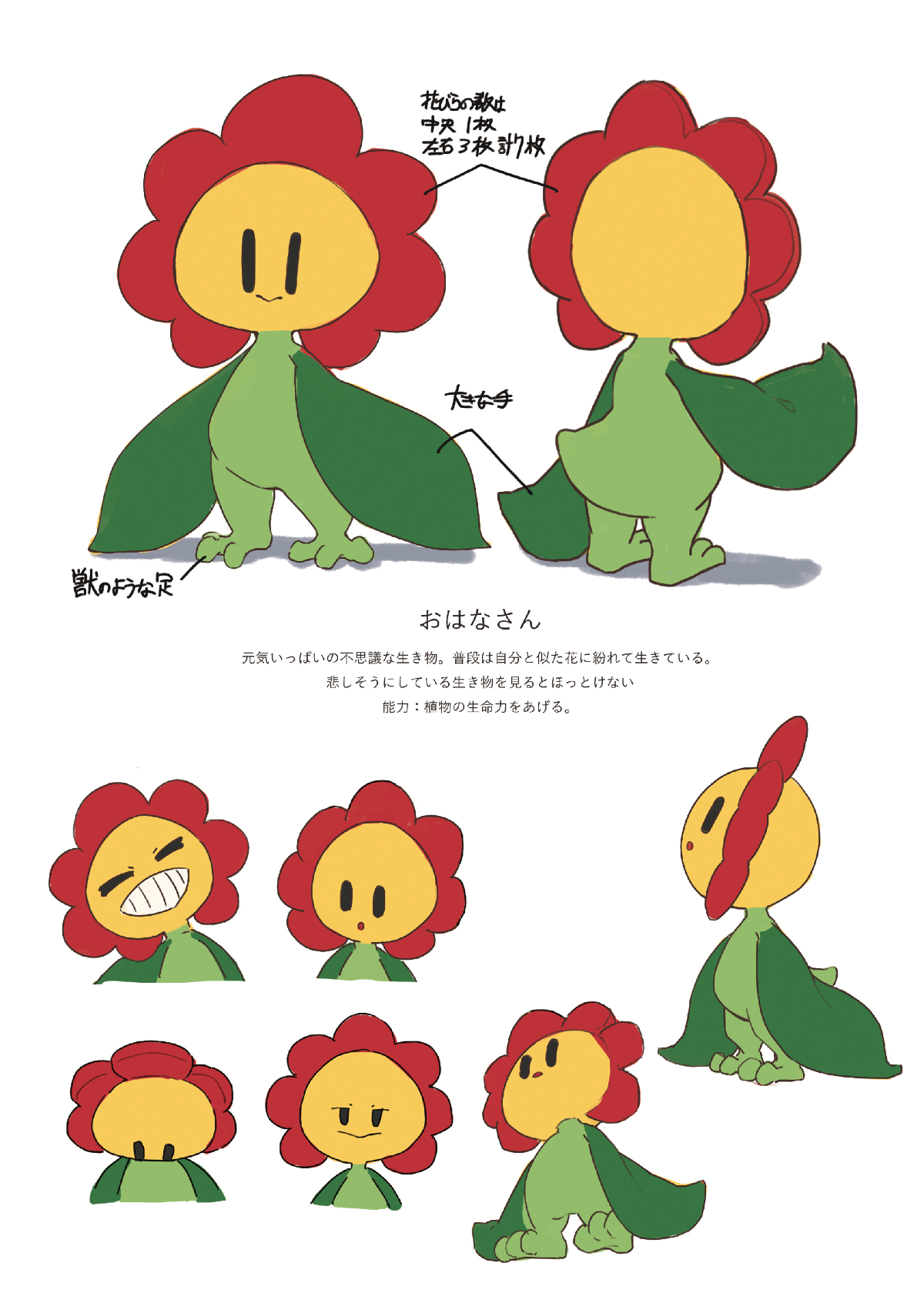 何十枚もの原画を描く為に、出来るだけ単純かつクオリティーに欠けない可愛いキャラクターを考えました。また、あらゆる角度での描写や性格や特徴の記載、顔の表情をいくつか入れることで原画を描く際に役立たせました。