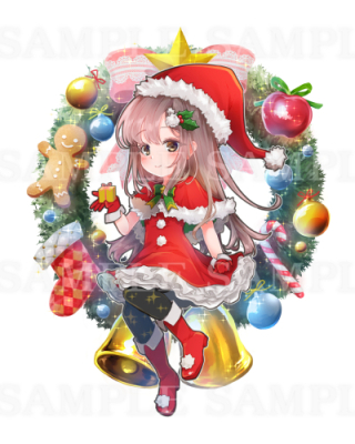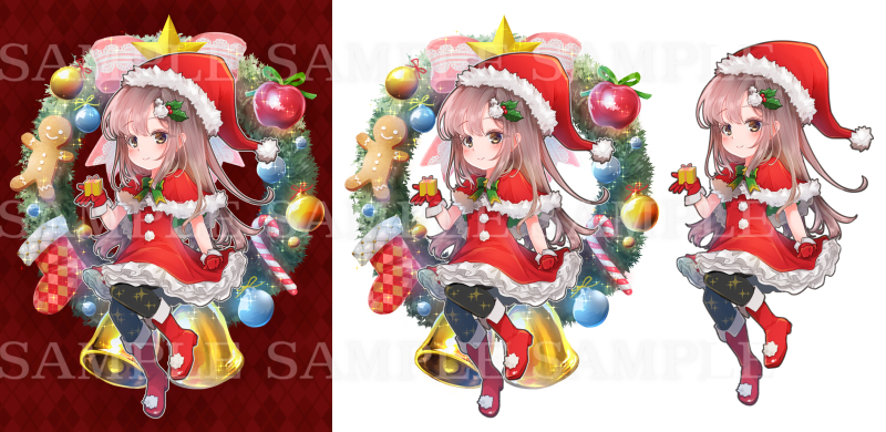キラキラ華やかで楽しい雰囲気のクリスマスを表現。女の子単体でもバランスが成り立つように気を付けました。想定利用シーンはクリスマス関連の挿絵など。