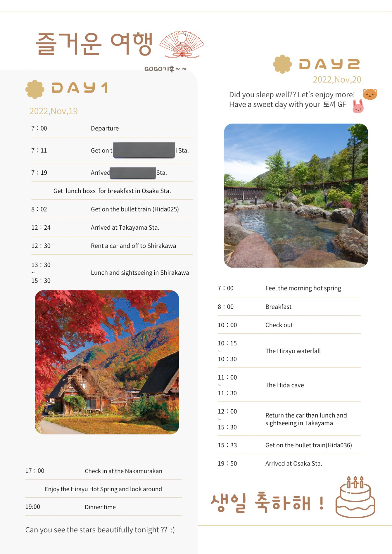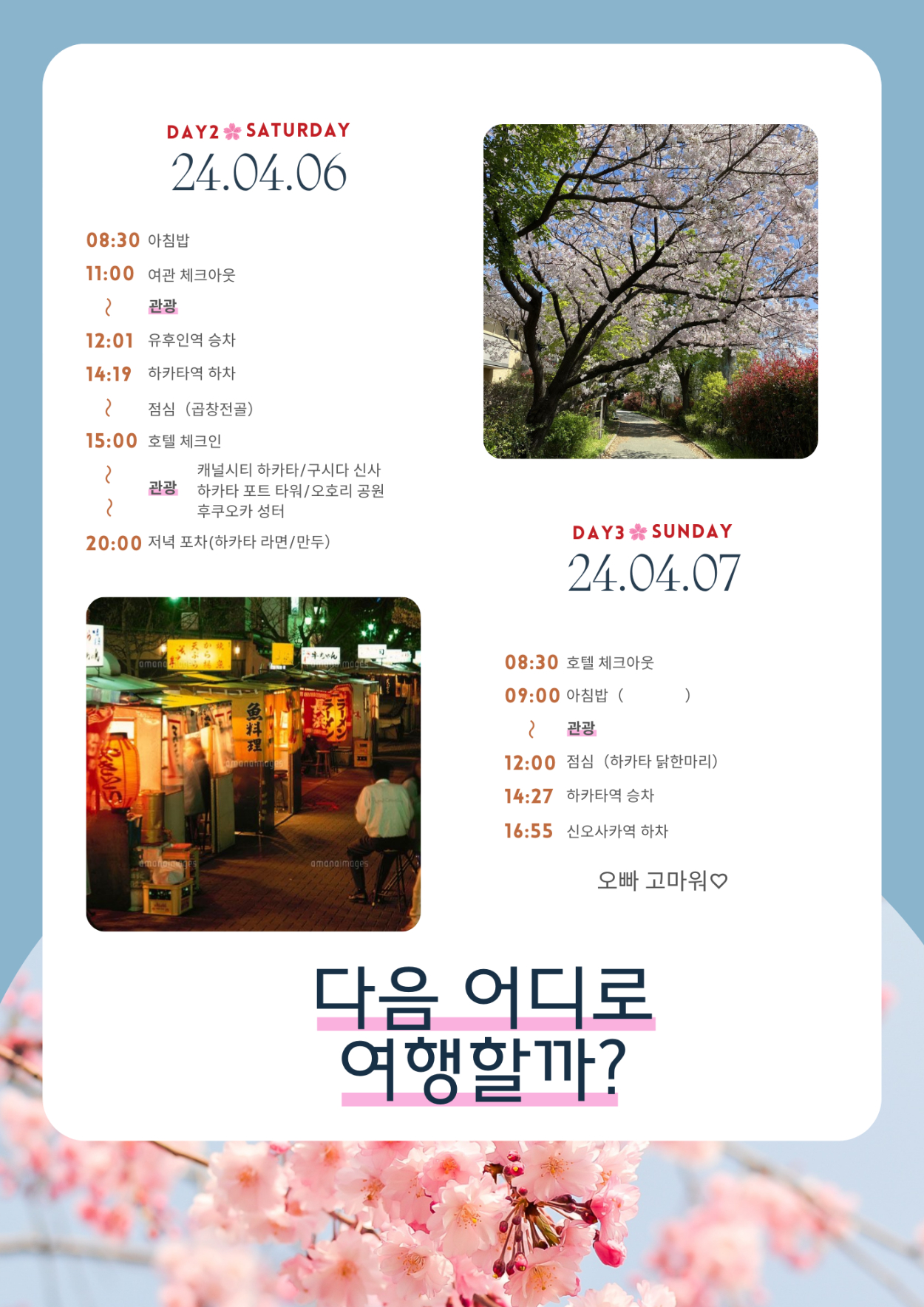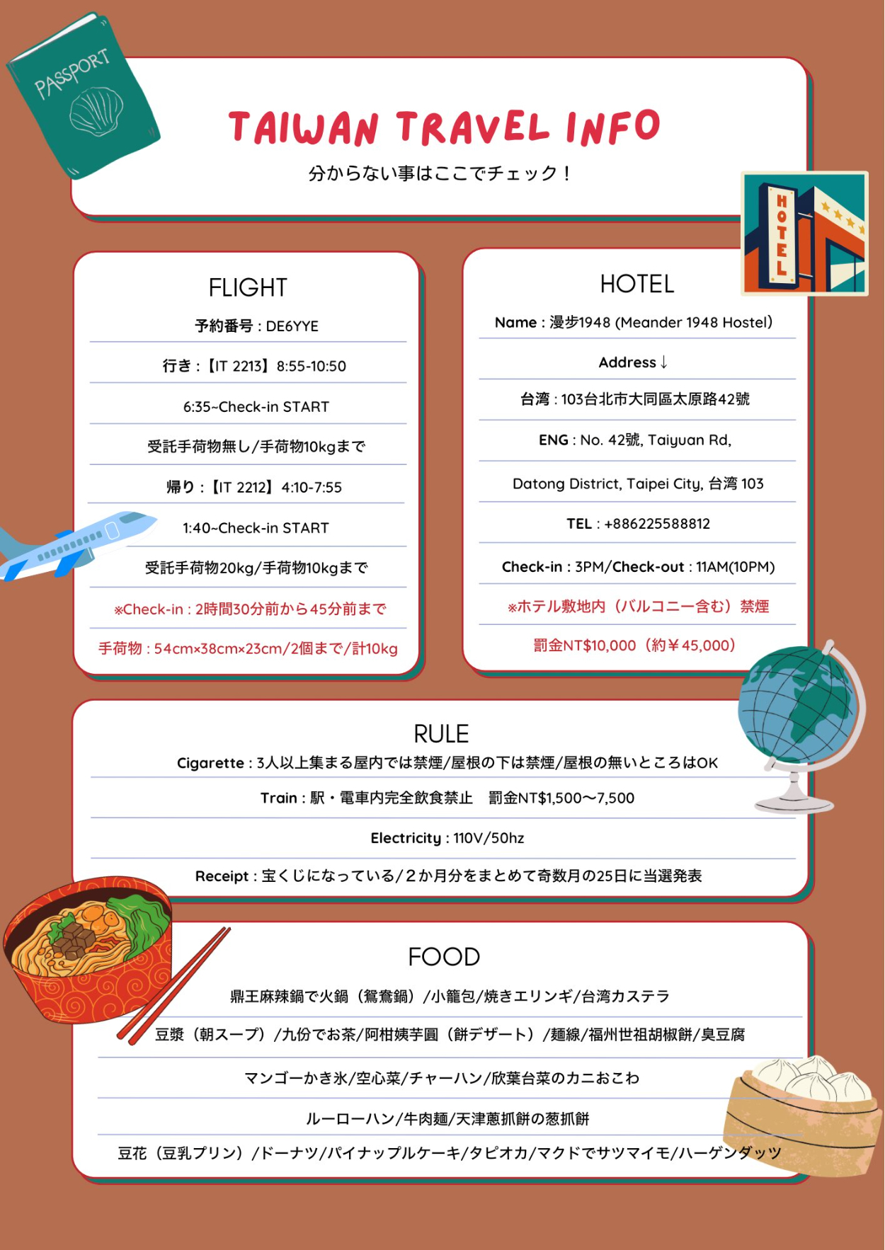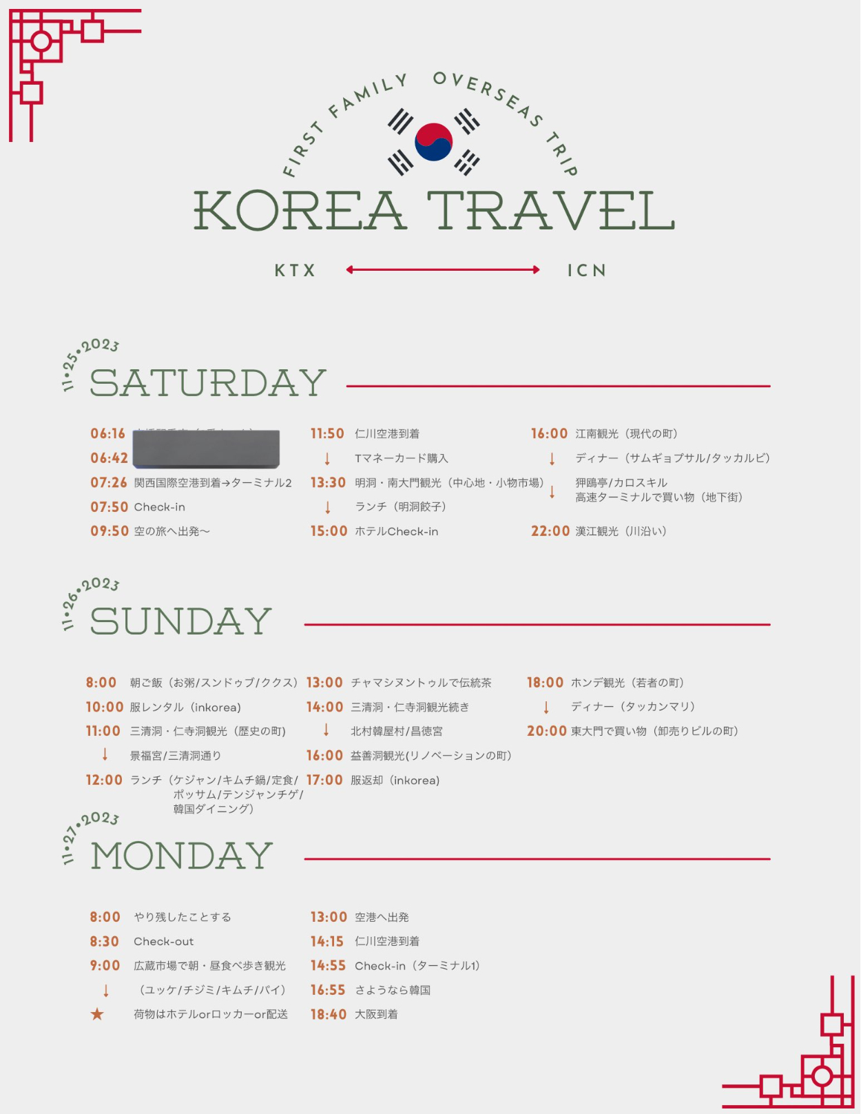 【自主制作】旅程表 Nabi(나비) WEBデザイナー・SNSマーケター・プランナー OVERVIEW 【Canva】企画・スケジュール・デザイン 2023/3 兵庫旅行2022/11 岐阜旅行2023/8 台湾旅行2024/11 京都旅行2024/11韓国旅行2024/04 九州旅行2024/5 香港・マカオ旅行