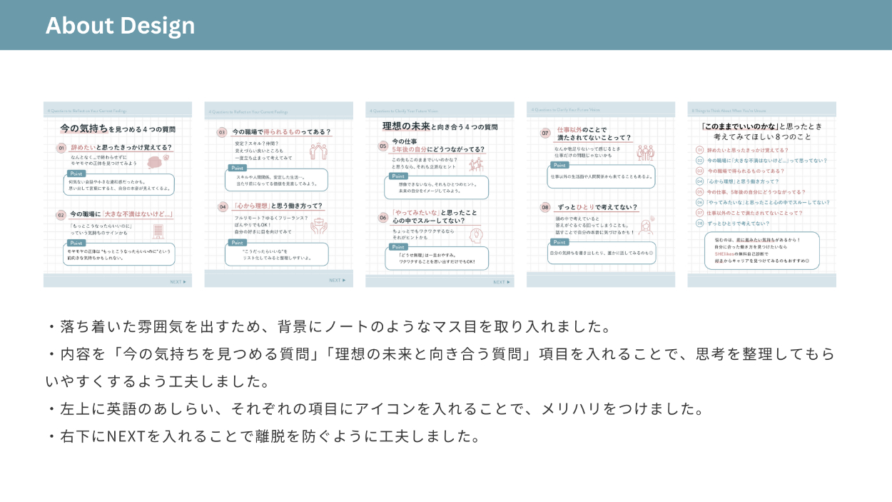 ・内容を「今の気持ちを見つめる質問」「理想の未来と向き合う質問」項目を入れることで、思考を整理してもらいやすくするよう工夫しました。