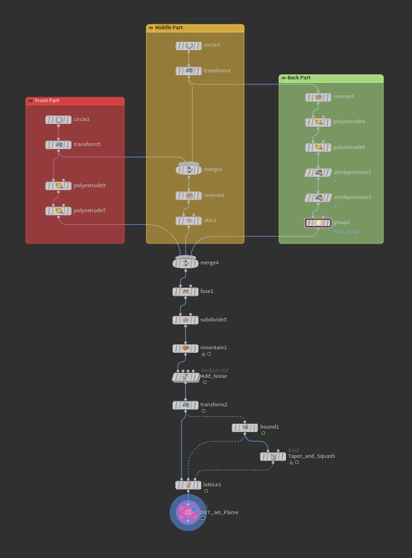 - 参考書籍では3ds Maxで作成されていたが、Houdiniを使用することによりプロシージャルに形状の変更が可能なのではないかと考え、制作を開始した。結果として、一つのデータファイルで複数の噴射形状に対応可能となった。