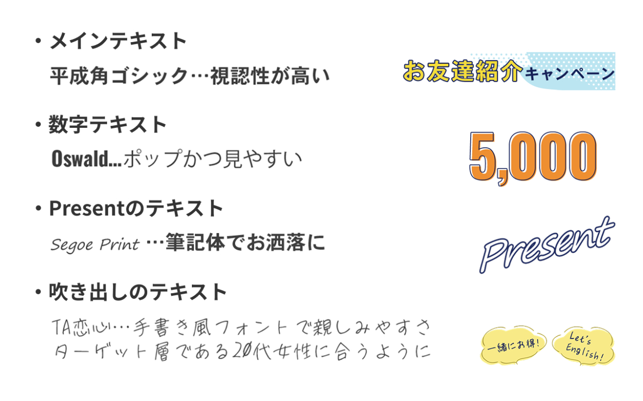 情報の信頼性: メインの数字やタイトルには「Oswald」や「平成角ゴシック」を使用し、キャンペーンの力強さと見やすさを重視しました。