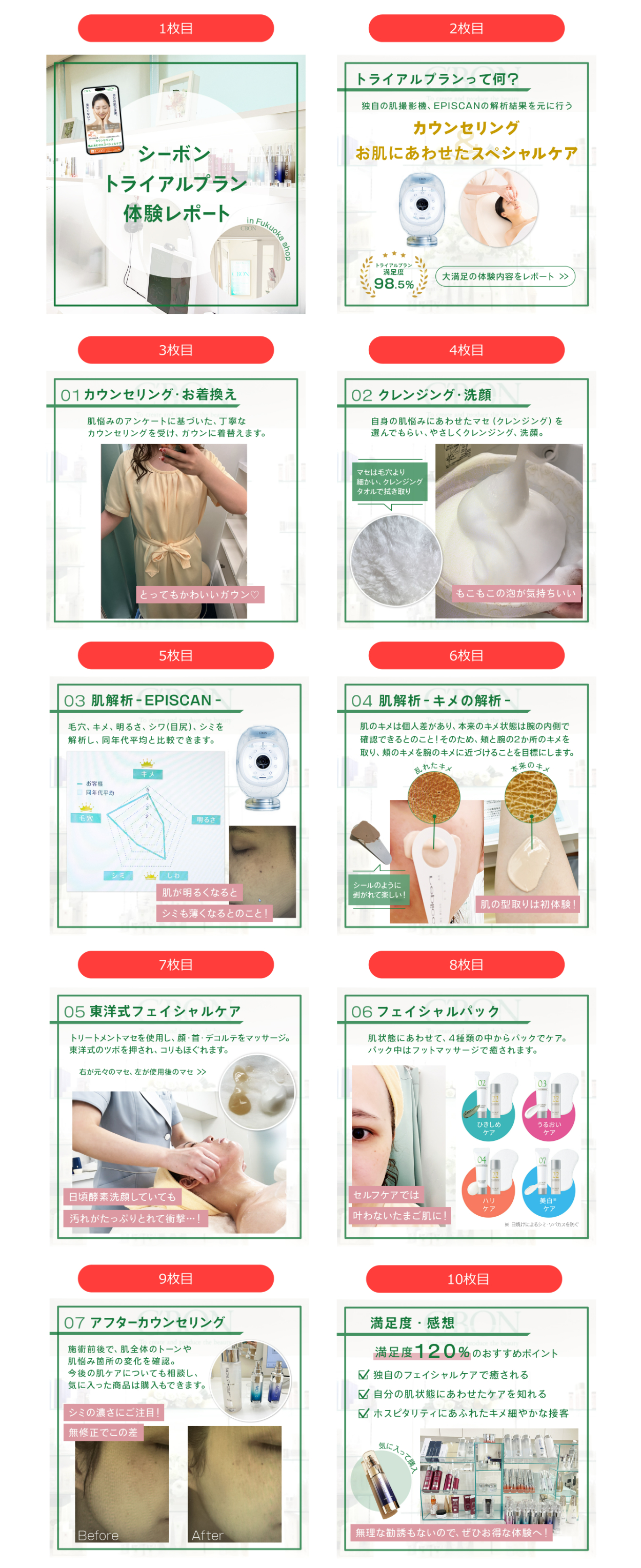 シーボン様商品購入で予約可能な、店舗での東洋式フェイシャルケアのトライアルプランを体験したレポートをInstagramのフィード投稿として制作しました。