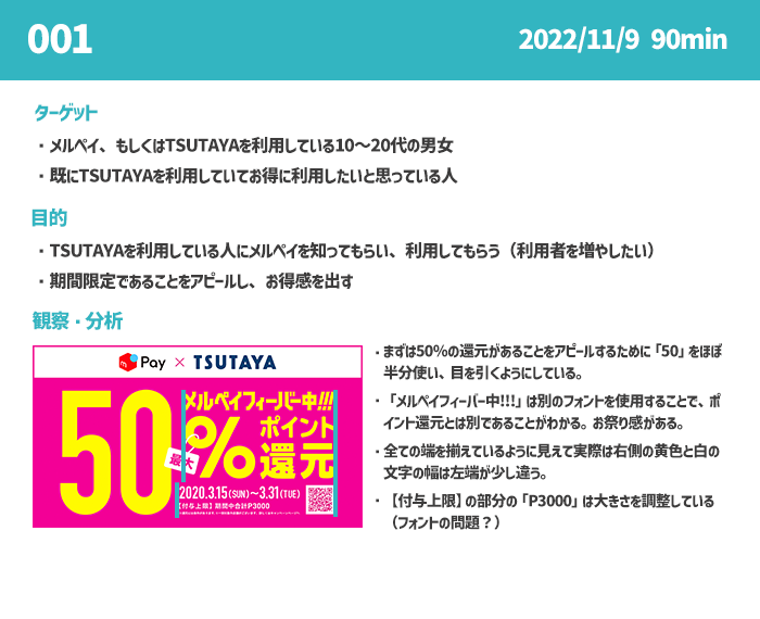 ・フォントの選び方や、大きさ、配置する幅の設定が工夫されており、参考になった。(目立たせ方、フォントの遊び方等)