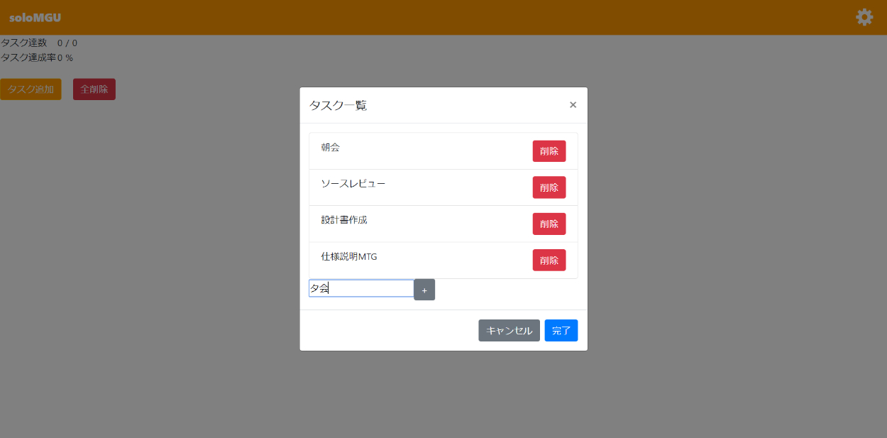 タスク追加モーダルにタスクを入力して完了ボタン押下