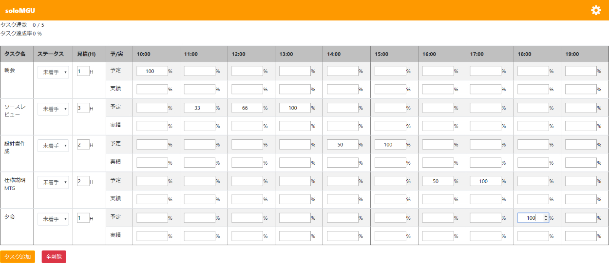 例:見積が3Hの場合は1時間あたりに33%ずつ進める必要があるため33%→66%→100%のように3つに分けて記入する