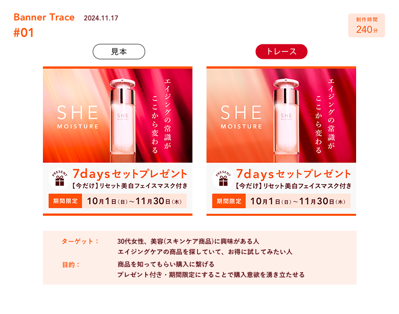 SHElikes MULTI CREATOR COURSEの課題にて、バナートレースに取り組みました。 バナーの目的やターゲットについての考察、デザインがどのような意図で設計されているのか観察・分析を行いました。