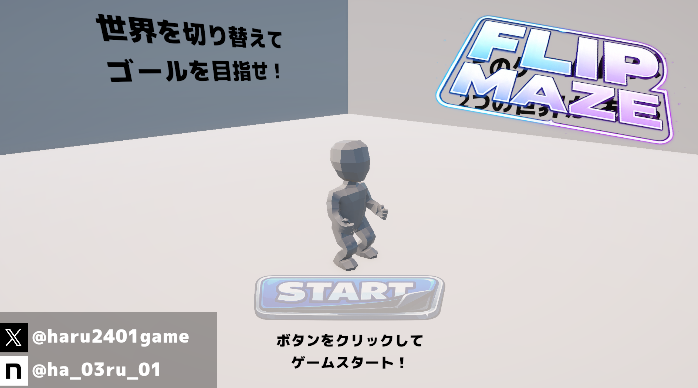 「Flip Maze」 長屋 晴太|Nagaya Haruta ゲームプログラマ志望 専門学生 OVERVIEW #個人制作 #Unity #Unityroom YEAR 2026 - 2026 ジャンル:3D, アクション, 謎解きプレイ人数:1人制作期間:2026/03 ~ 2026/04制作人数:1人===実績===「ゲームジャム」unity1week「うら」参加作品 WEBSITE