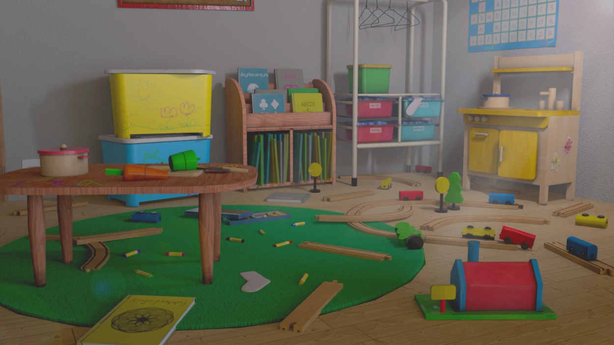 物量が感じられるに変更。バランスを考慮して棚と玩具箱の配置を変更。おもちゃの追加