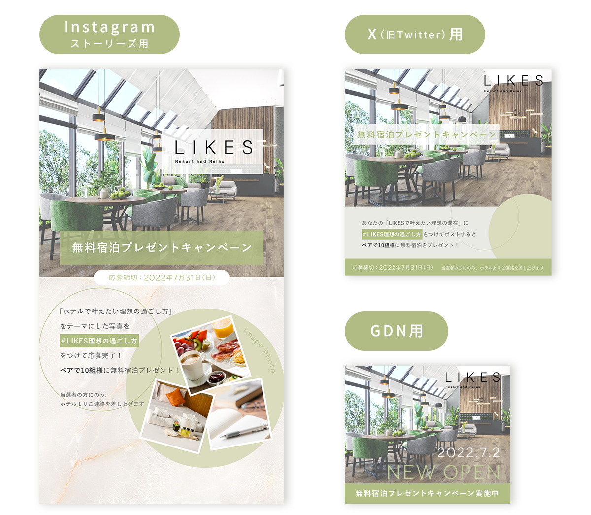 『キャンペーンサイトへの告知用バナー』(①Twitter用、②Instagramストーリーズ用、③GDN用
