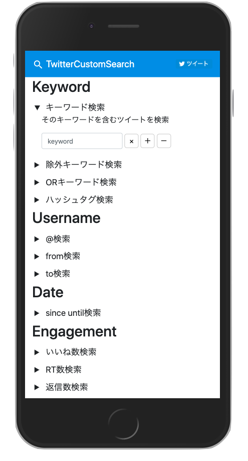 TwitterCustomSearch Takahashi_Naoki 大学生 OVERVIEW Twitterでの高度な検索の利便性を増すために作成したWebサイト ユーザーの意見などの市場調査でTwitterの検索の頻度が上がったため,補助ツールとして作成https://nyanko3142592.github.io/TwitterCustomSearch/ WEBSITE