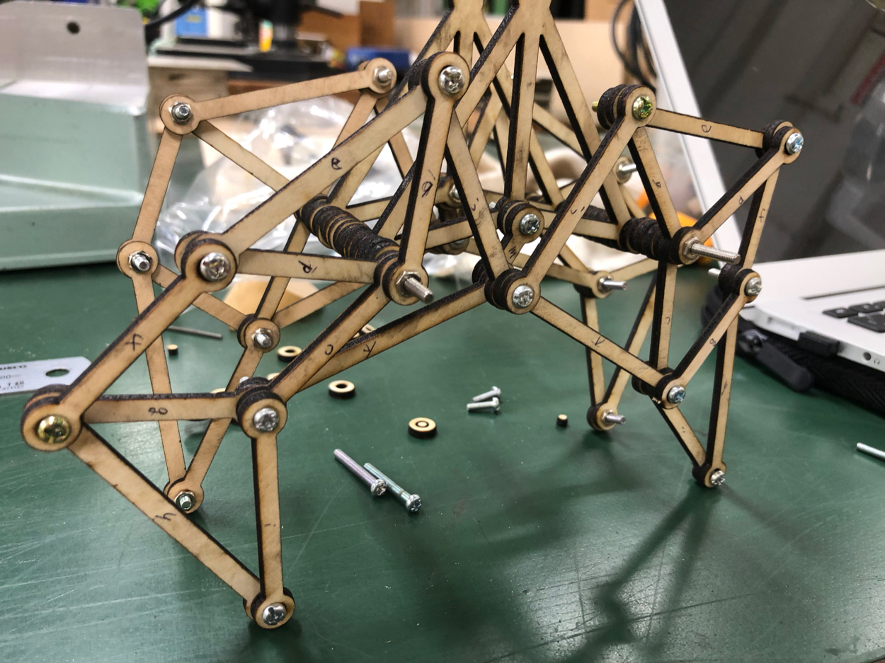 mock1を製作した。脚はMDF(3mm)、胴体はユニバーサルボードを用いた。今回の試作から、MDFでの製作の難しさと2次元的な部品の製作では限界があると感じた。