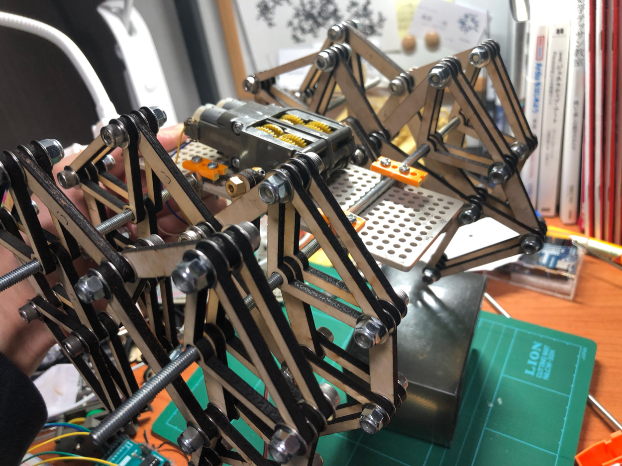 ”歩く”や”座る”というmotionは、単純な動作のように見える、しかし良く考えてみると複雑で魅力的だなと思った。だから足で歩くというロボットを製作するということを通して「歩行」というmotionの再認識ができればいいなと思い作り始めた。