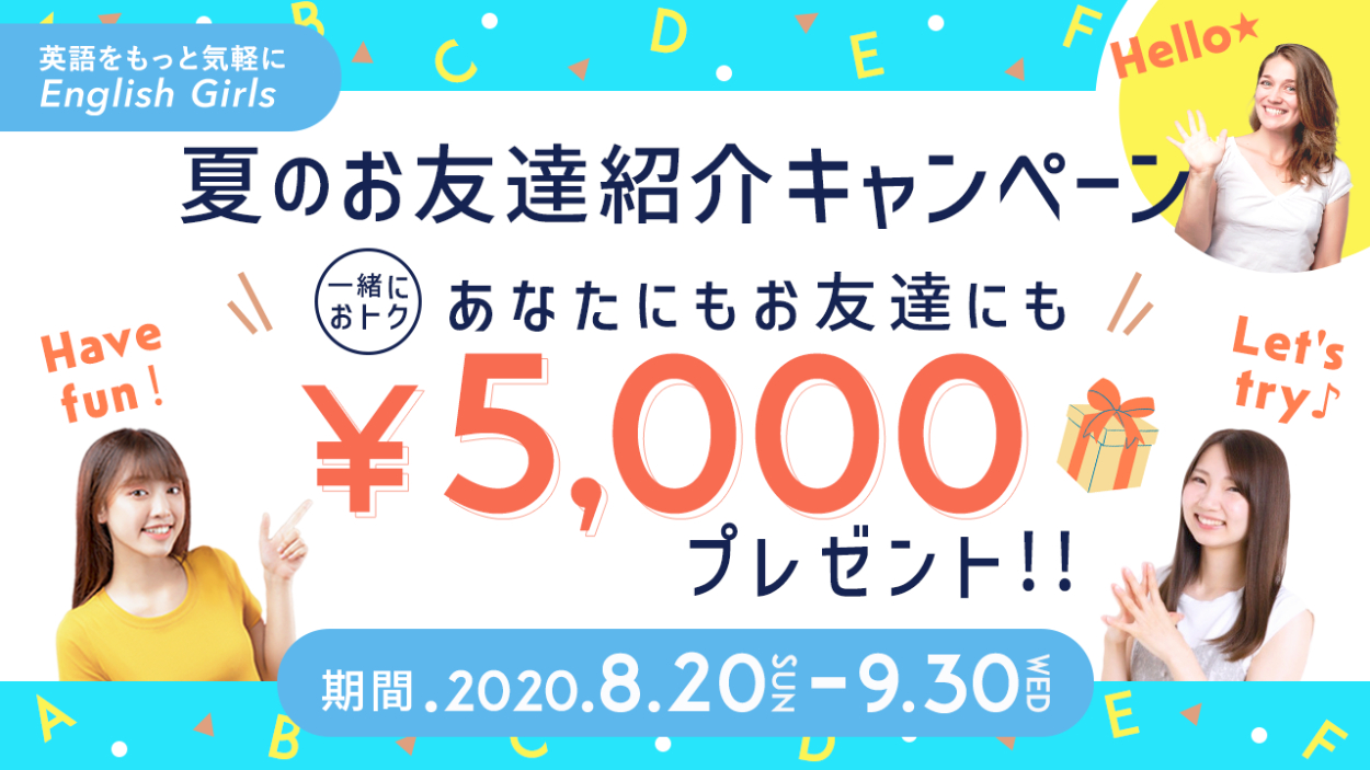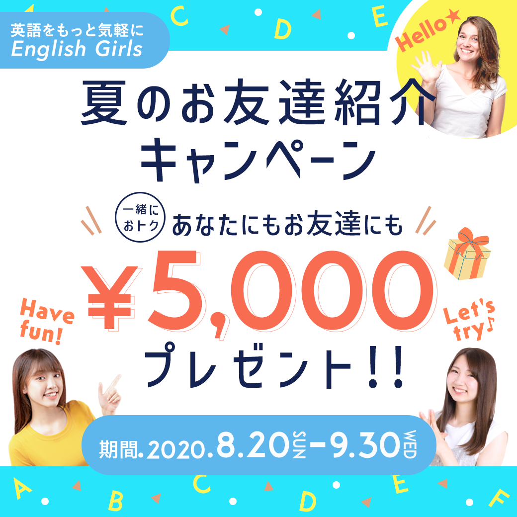 <文言>①夏のお友達紹介キャンペーン ②あなたにもお友達にも5,000円プレゼント ③期間:2020年8月20日~9月30日 ④一緒にお得!