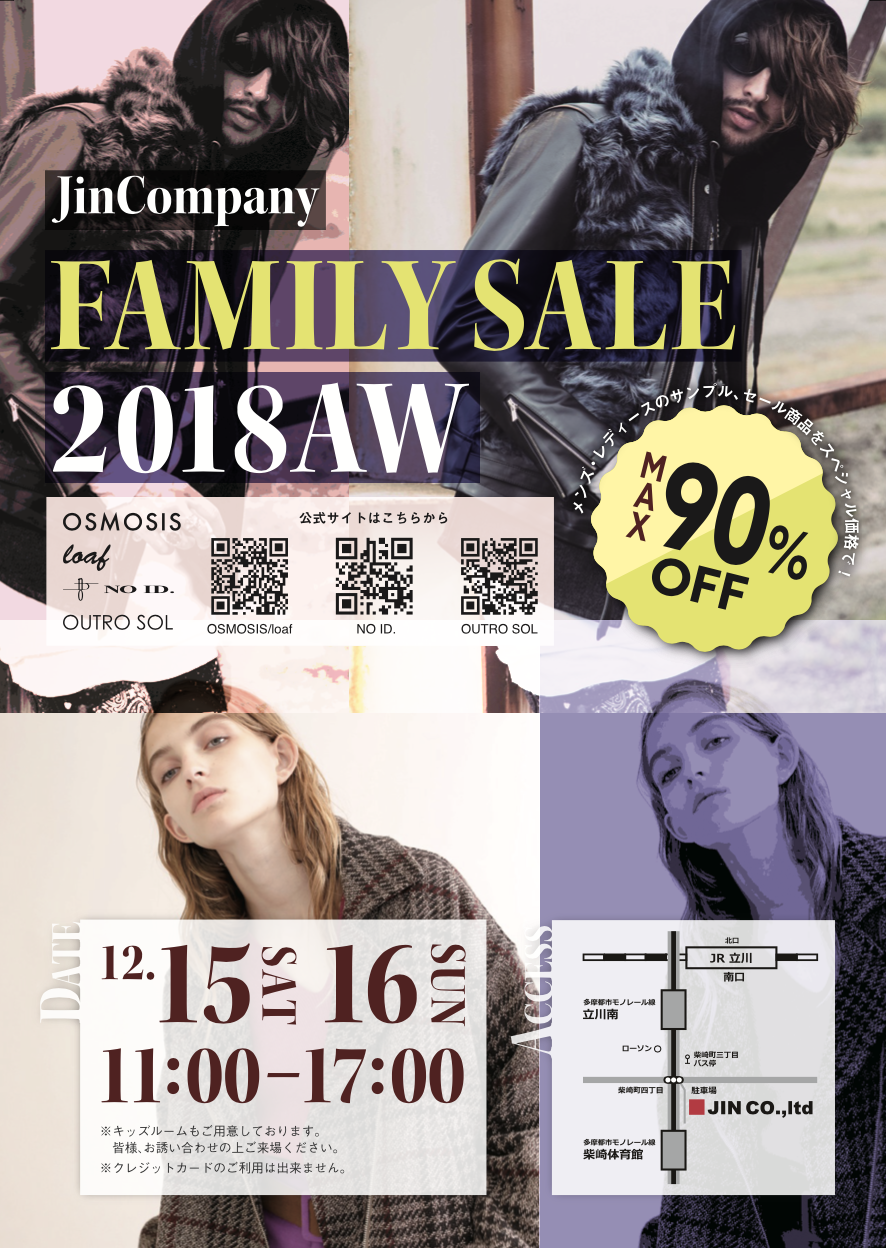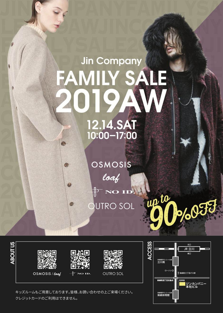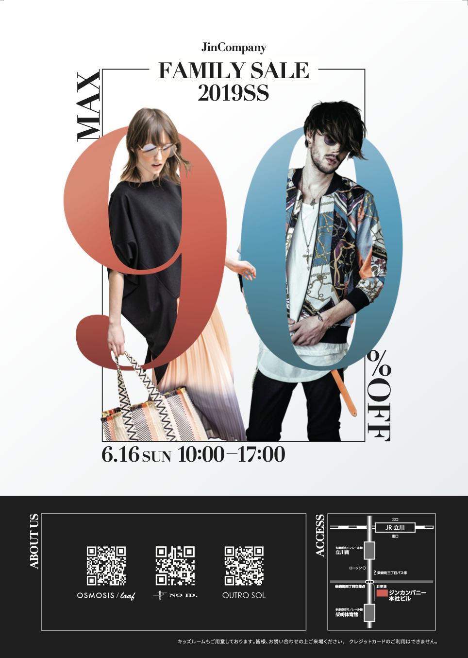 【フライヤー】ファミリーセール案内(ジンカンパニー株式会社様) 藤原奏人/Kanato Fujiwara ventus Inc. Design Lead OVERVIEW OSMOSIS, NO ID をはじめとする幅広いアパレルブランドを展開するジンカンパニーの、ファミリーセールのフライヤー制作を担当しています。 YEAR 2019 WEBSITE