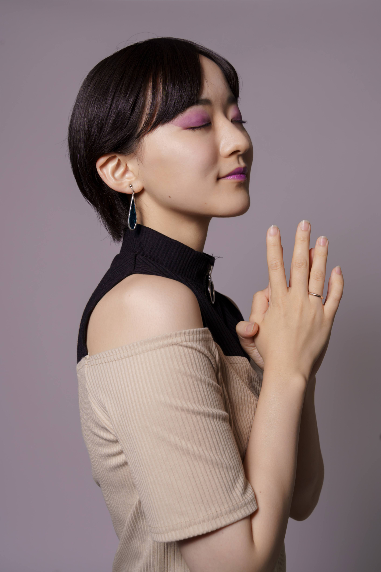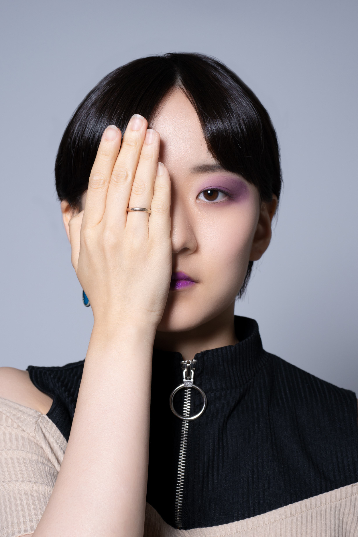 左右非対称に、紫いろのアイシャドウを使用して、アーティスティックなメイクを作り上げてほしいというご要望だったので、