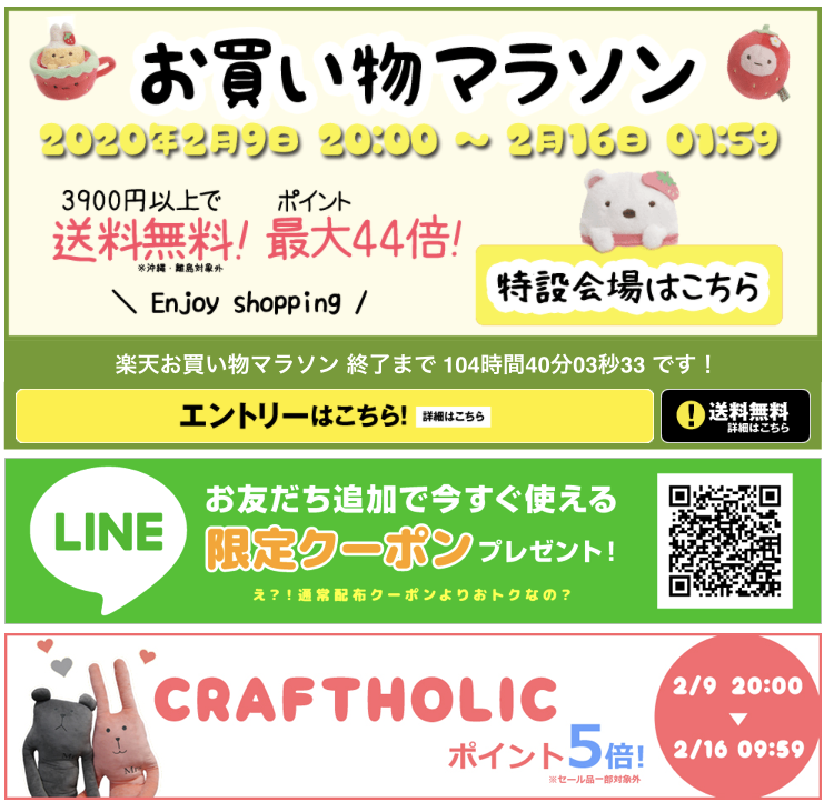 私は主に楽天イベントを担当しており、こちらは楽天お買い物マラソンのページの一部です。セールにする対象商品の選定やイベント内容の企画~バナー作成、ページ構成も手掛けました。