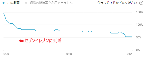 ⇒YouTubeアナリティクスでは、コンビニ到着後は、視聴維持率が横ばいの結果に。