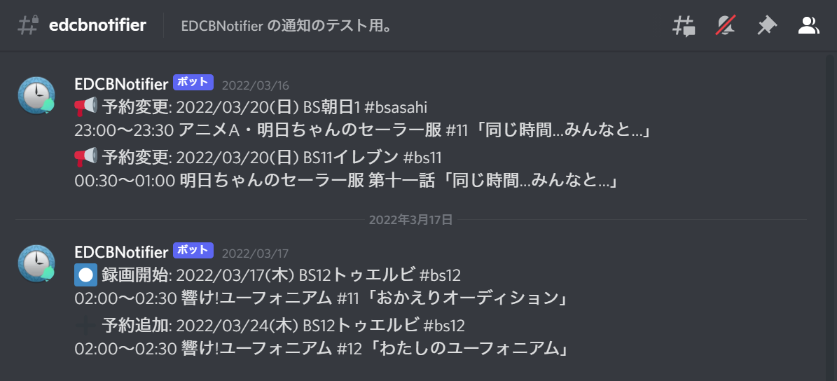 2021年の年末に、Discord の Webhook を使って Discord にも通知を送れるようにしました。個人用のサーバーを作成した上でそこに EDCBNotifier の通知用チャンネルを作り、そこから通知を受け取れるようにすることが前提です。