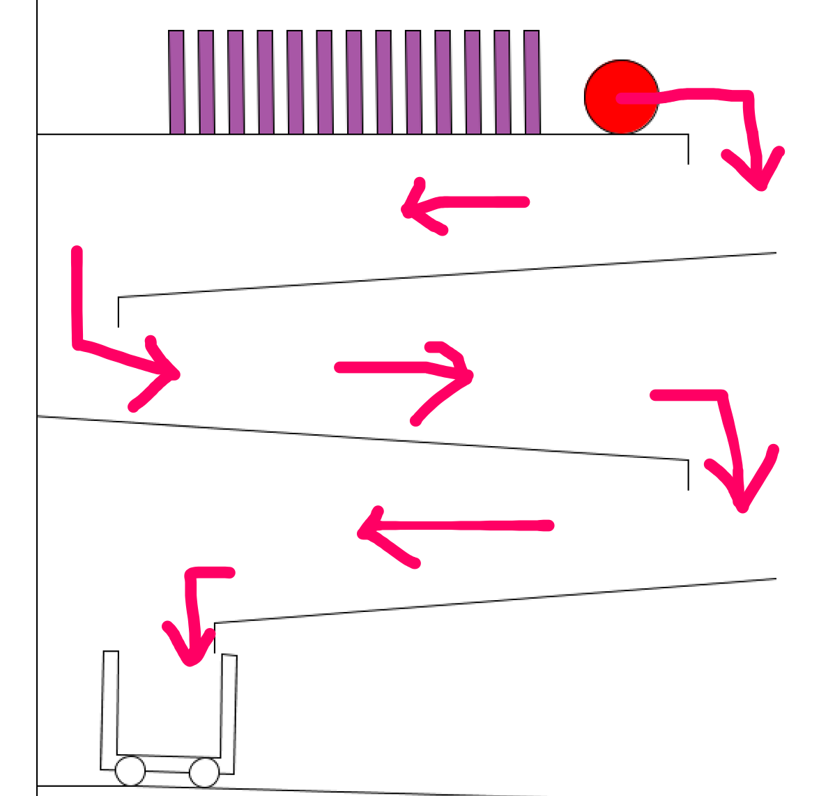 第2 の装置は3 つの坂である。ボールが落ちると、3 つの坂を下っていく。下の線は、ボールが変なところに落ちないようにしているものである。ボールは坂を下ると、トロッコの中に入る。