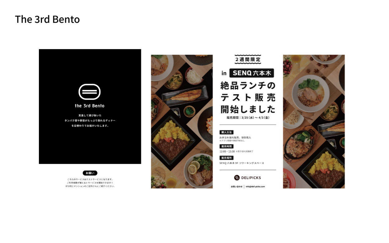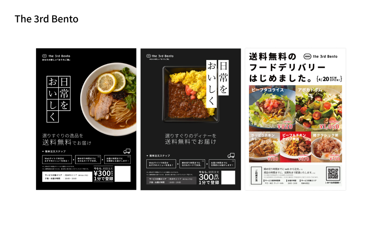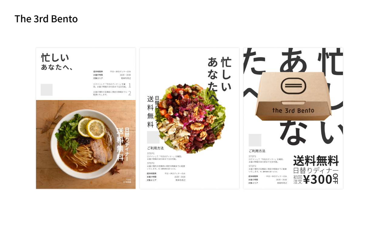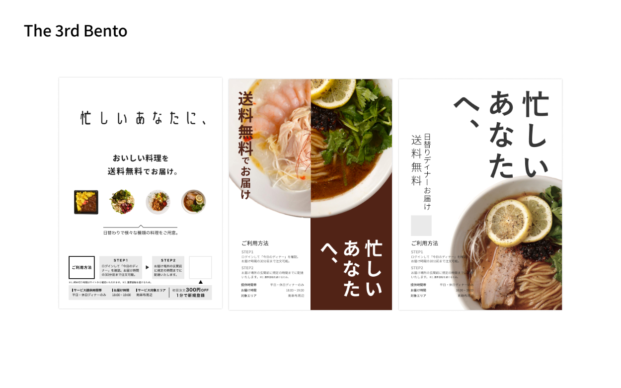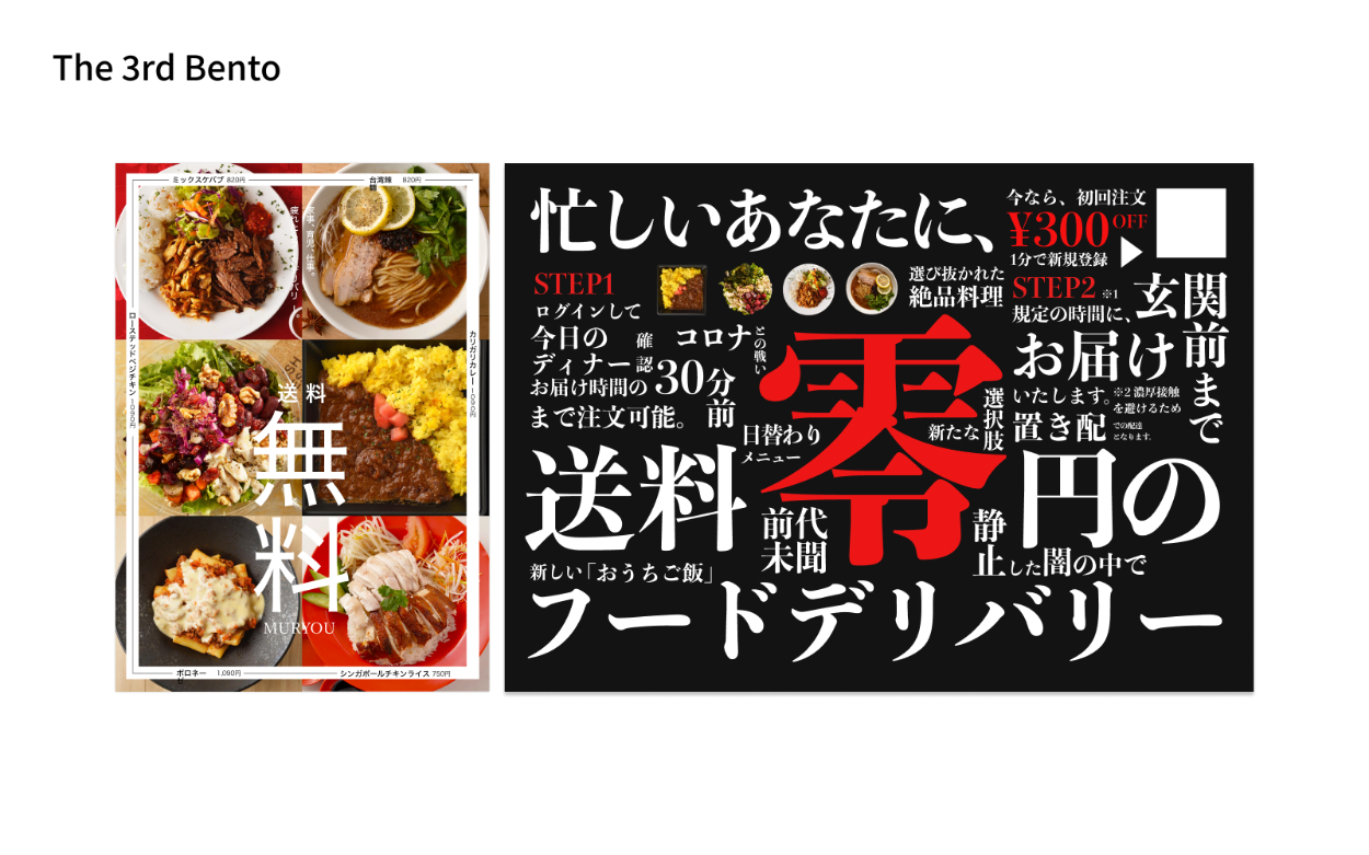 The 3rd Bentoチラシ制作 いけうち UXUI designer OVERVIEW コロナ渦で外食ができなくなった忙しいビジネスマンにキュレーションした料理をデリバリーするサービスの広告 YEAR 2020 普通に情報を伝えるものから、グラフィックなものまでアイデアがなくなるまでデザイン案を出した。