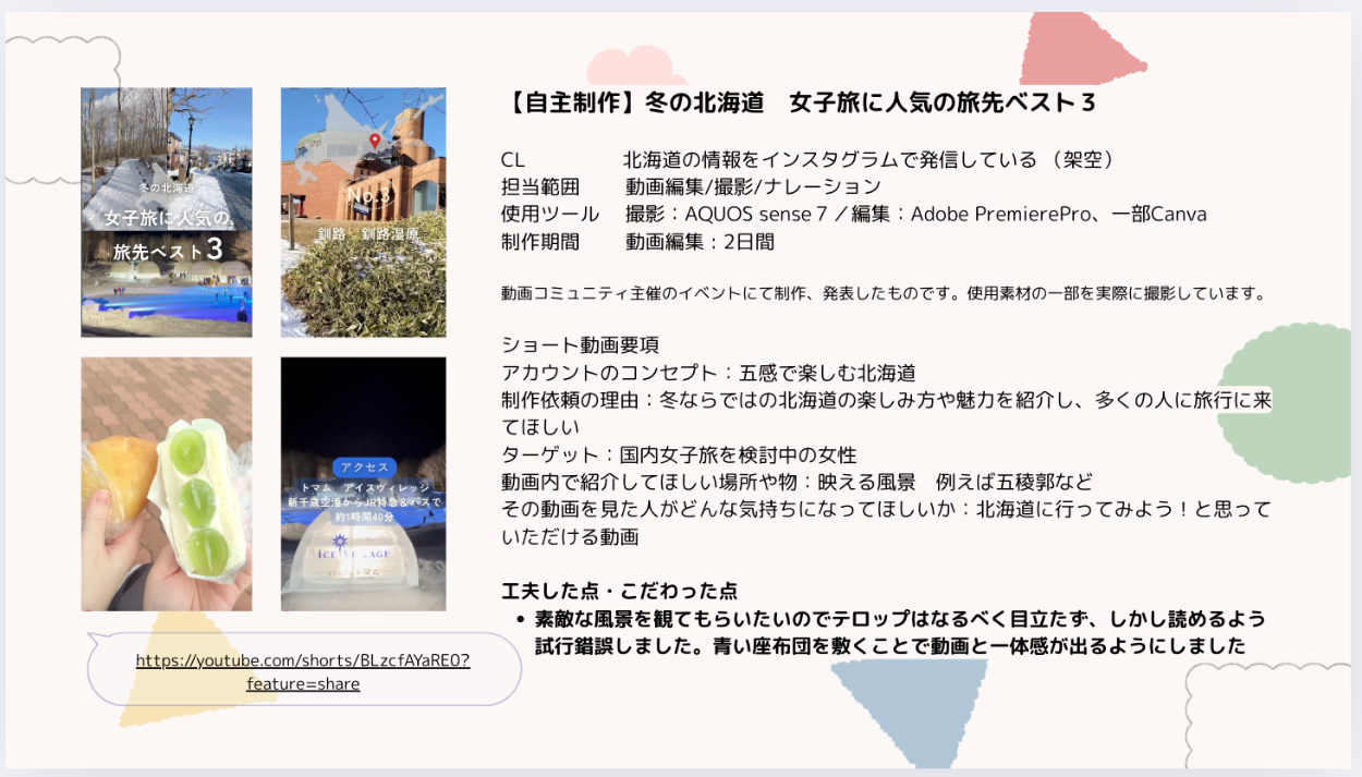 今回制作依頼の理由:冬ならではの北海道の楽しみ方や魅力を紹介し、多くの人に旅行に来てほしい