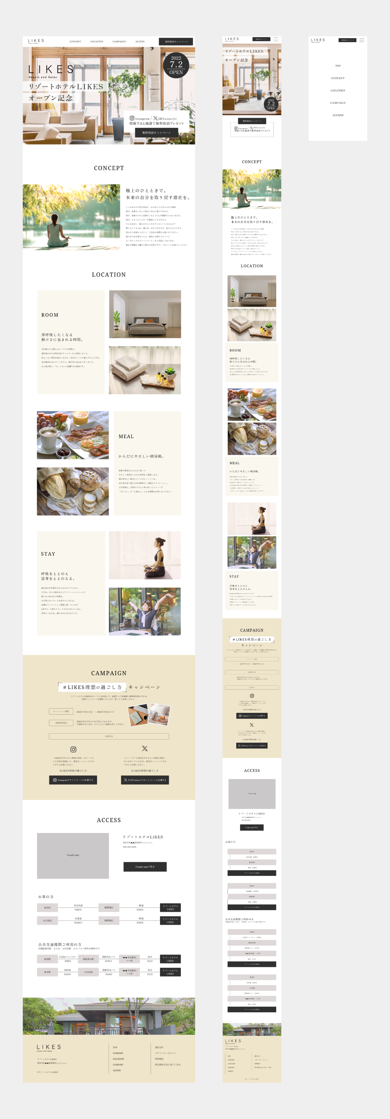オンラインスクール「SHElikes」受講課題。リゾートホテルのオープン記念キャンペーンの訴求サイトを制作しました。