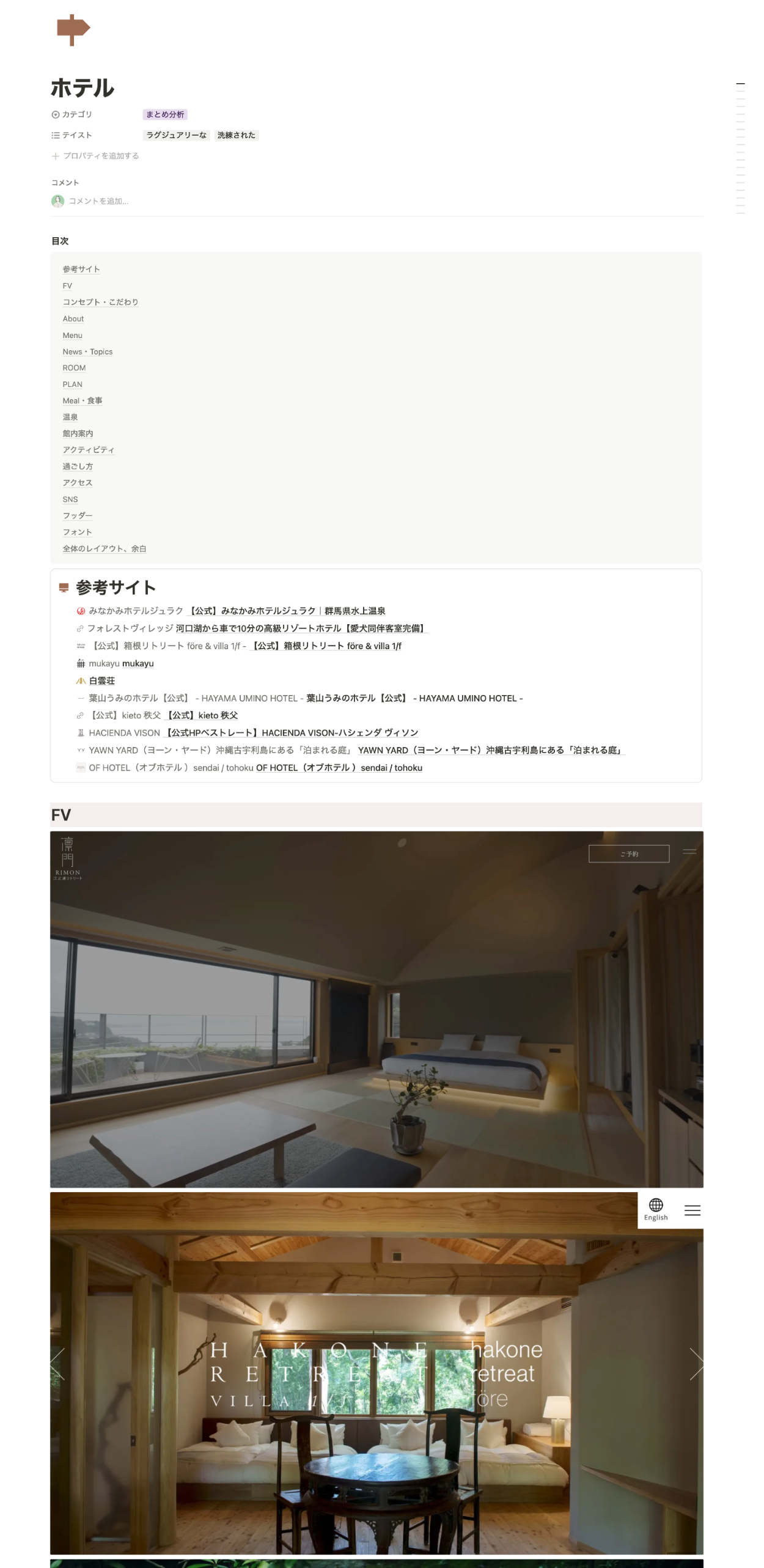 入念にリサーチをしながら、要件定義に則した情報設計、デザインを意識。参考になりそうなサイトをNotionにストックし、架空のクライアントの提示した「洗練されたホテルのイメージ」を分析。