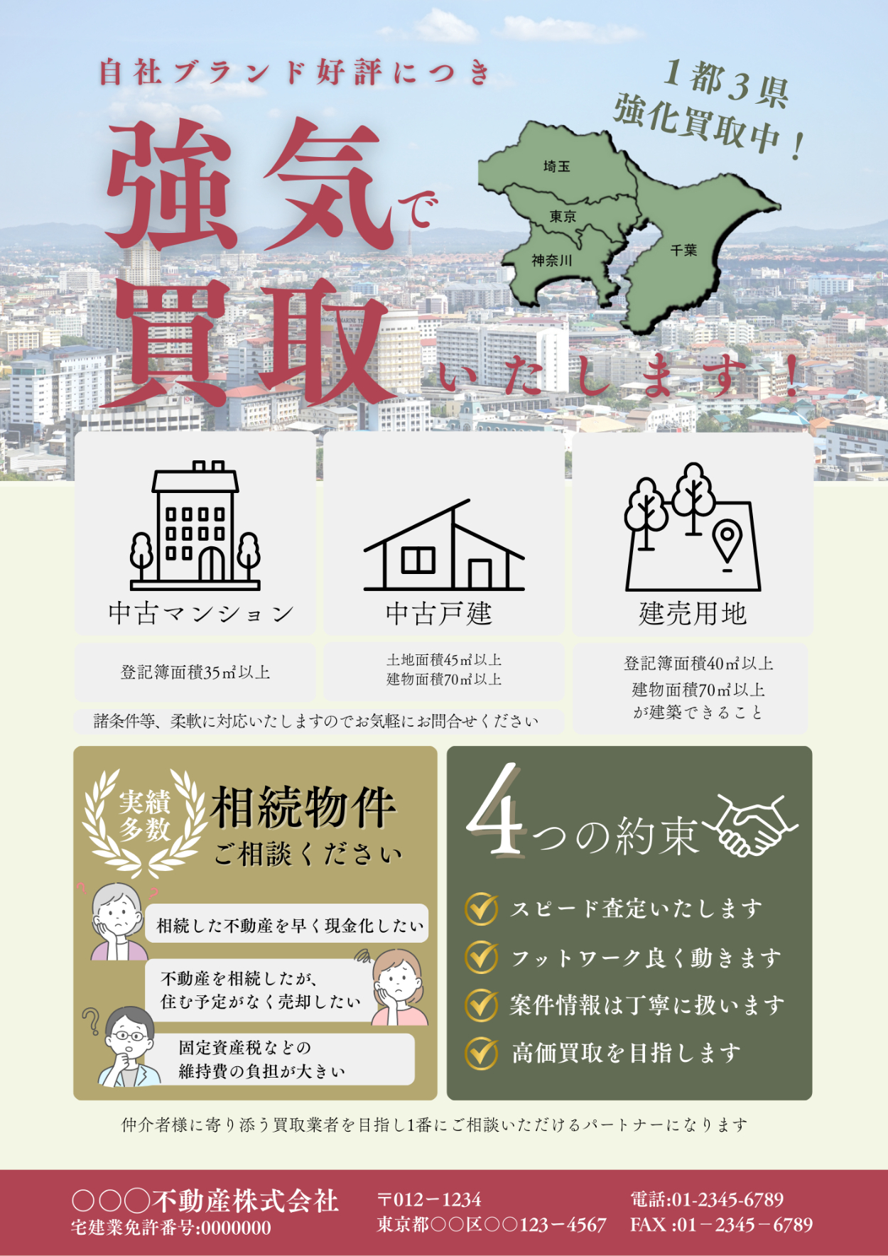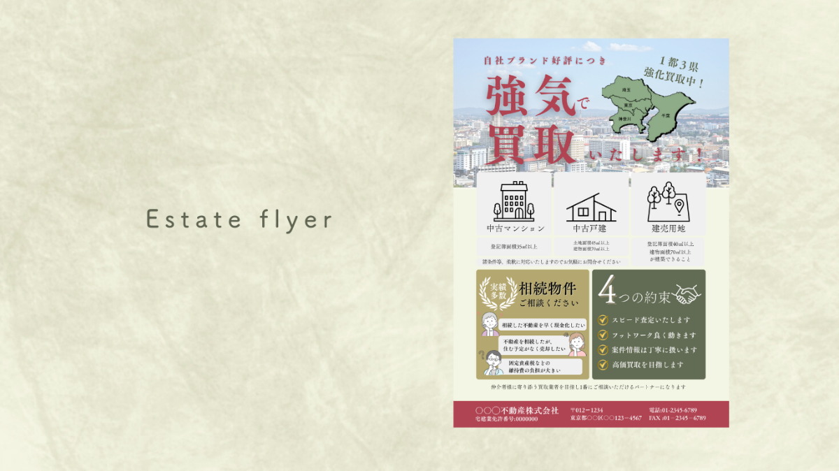 クラウドワークスのデザインコンペにて採用いただいた作品です。 不動産会社様が配布する物件買取訴求チラシを制作しました。