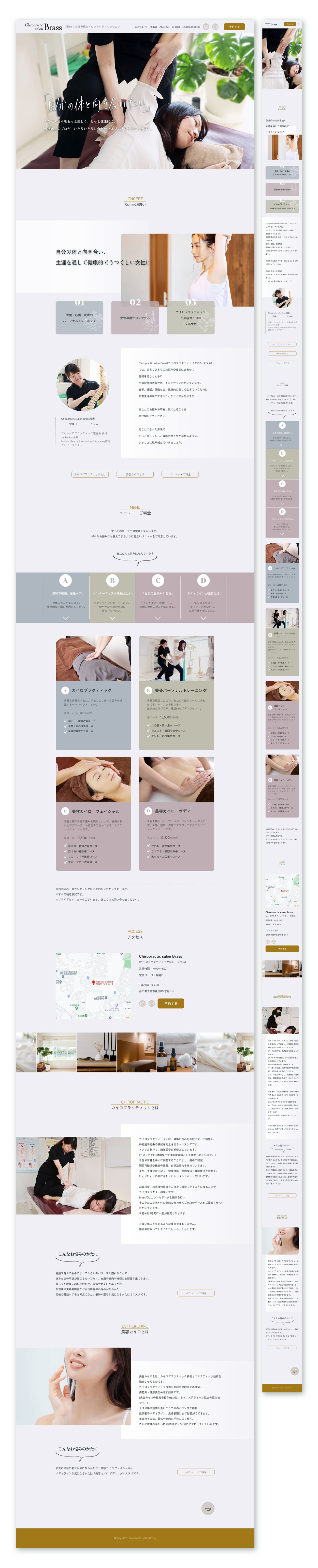 女性がターゲットなので、文字が多いよりも、雰囲気が伝わり、自分に必要な情報が先に簡単に分かる方が興味を持ってもらえると考え、文字量の多い「カイロプラクティックとは?」「美容カイロとは?」というセクションを一番下に配置。