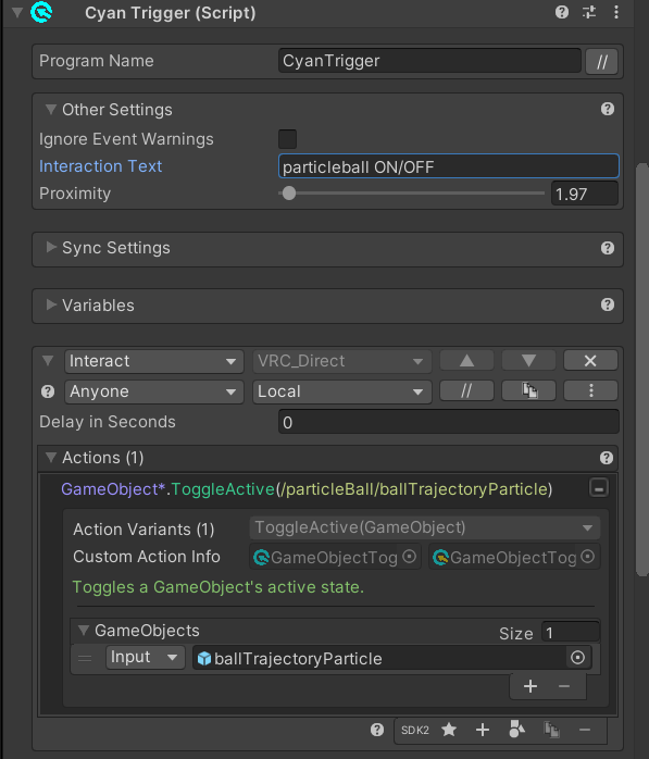 でヒエラルキーの中にある「ballTrajectoryParticle」(自作パーティクル)をActionsの右下のSDK2からGameObjectを選び、その中に挿入しました