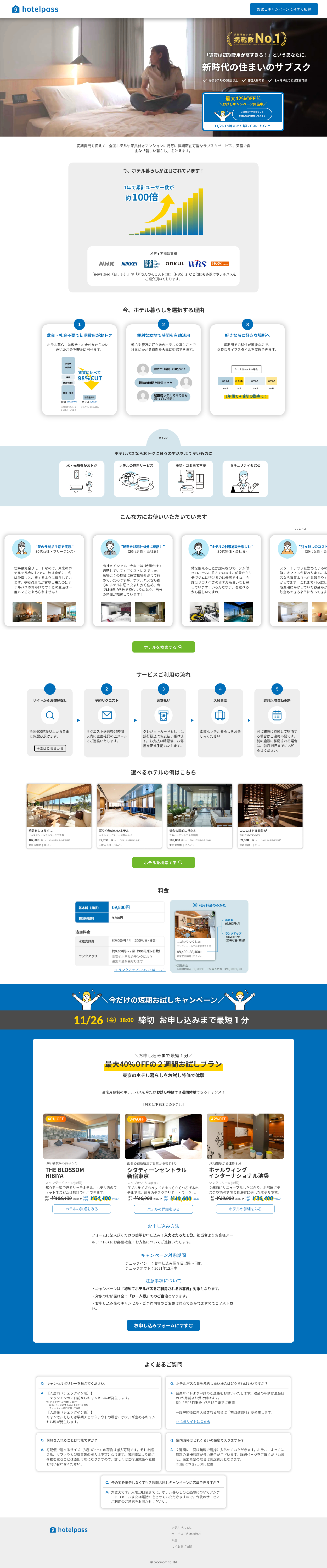 グッドルーム株式会社が運営するホテル暮らしのサブスクサービス「ホテルパス」のサービスLPを作成しました。