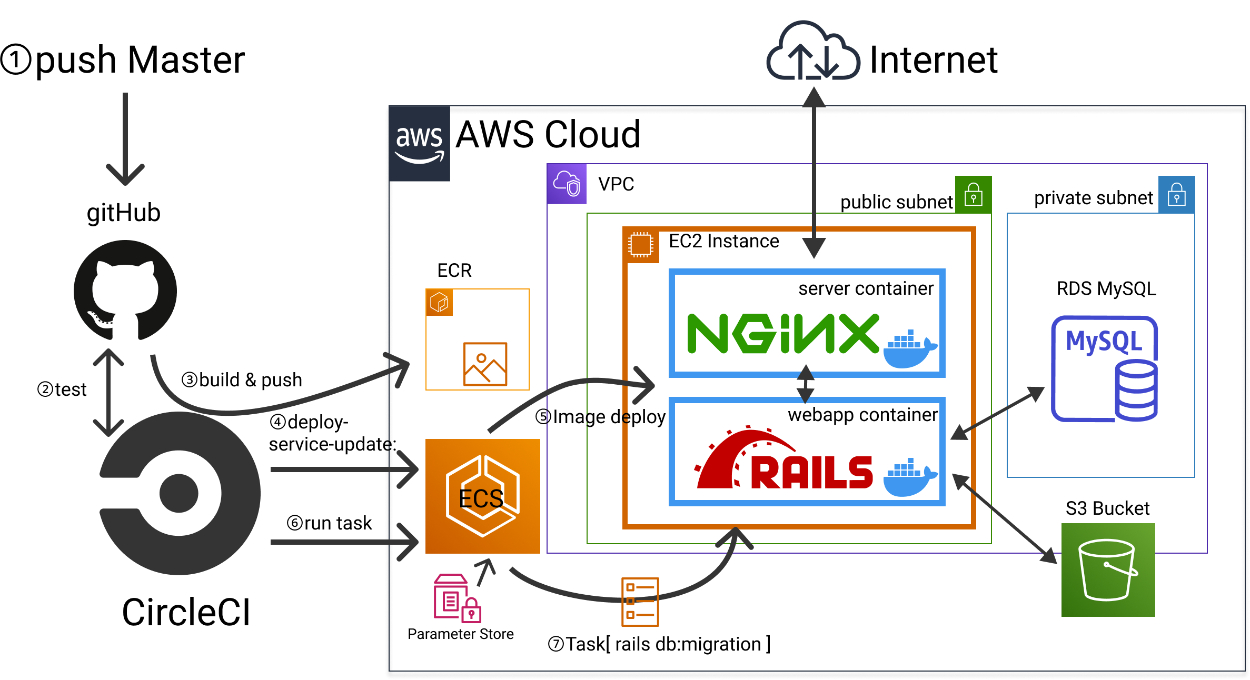 - AWS EC2インスタンス上にWEBアプリとしてRailsをUnicornで稼働したコンテナ、リバースプロキシとしてNginxを稼働したコンテナをECSのサービスとして配置