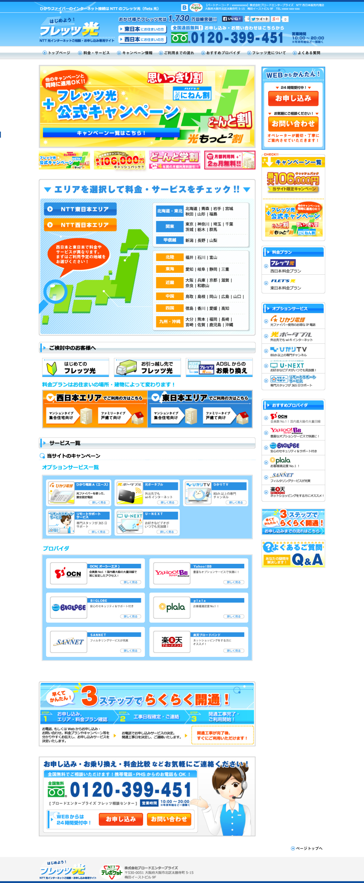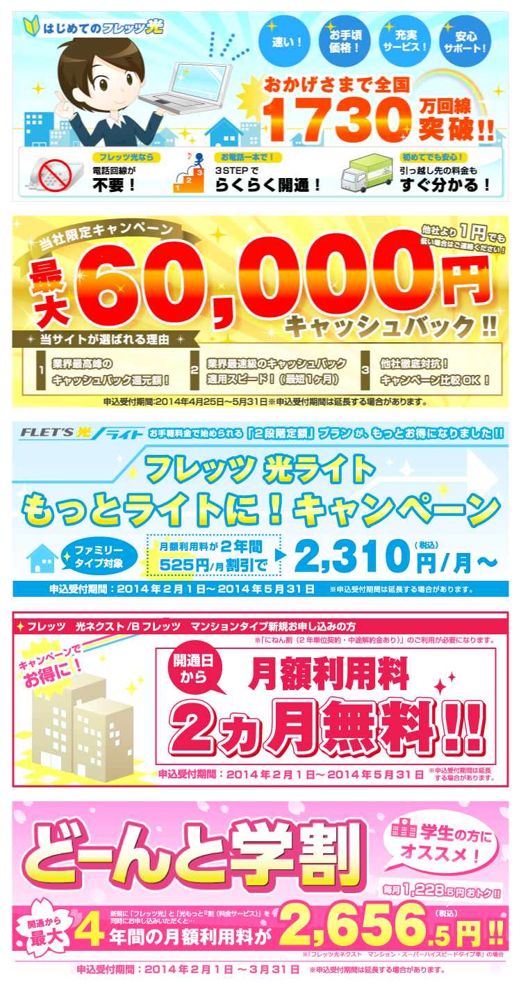 フレッツ光代理店 サイトデザイン yoshio WEBデザイナー OVERVIEW フレッツ光販売代理店のサイトデザイン・コーディングを担当しました。 テイストの違う2種類のデザインが必要だったので、イラスト表現なども使い分けています。 YEAR 2014 *----- キャンペーンバナー -----*
