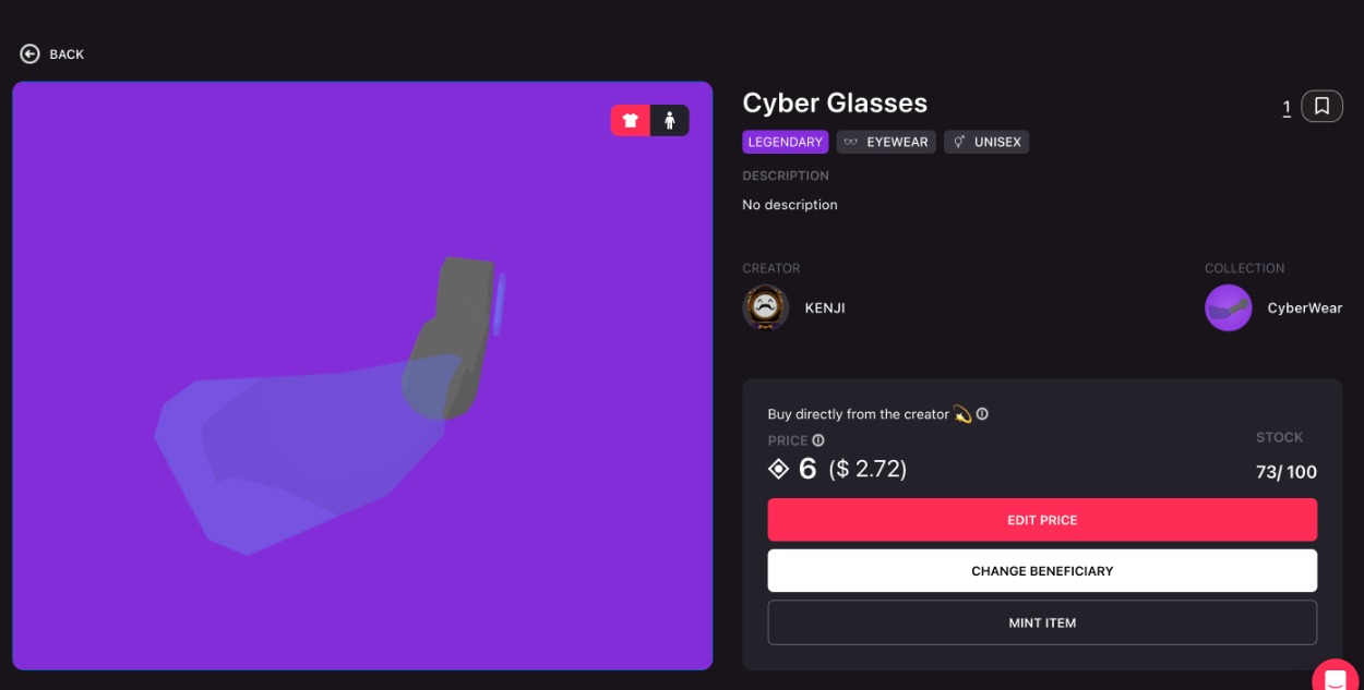 スカウター型のウェアラブル(アバターが着用するNFT)を作成、販売
