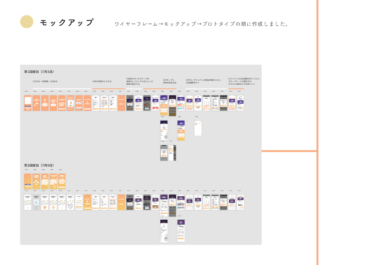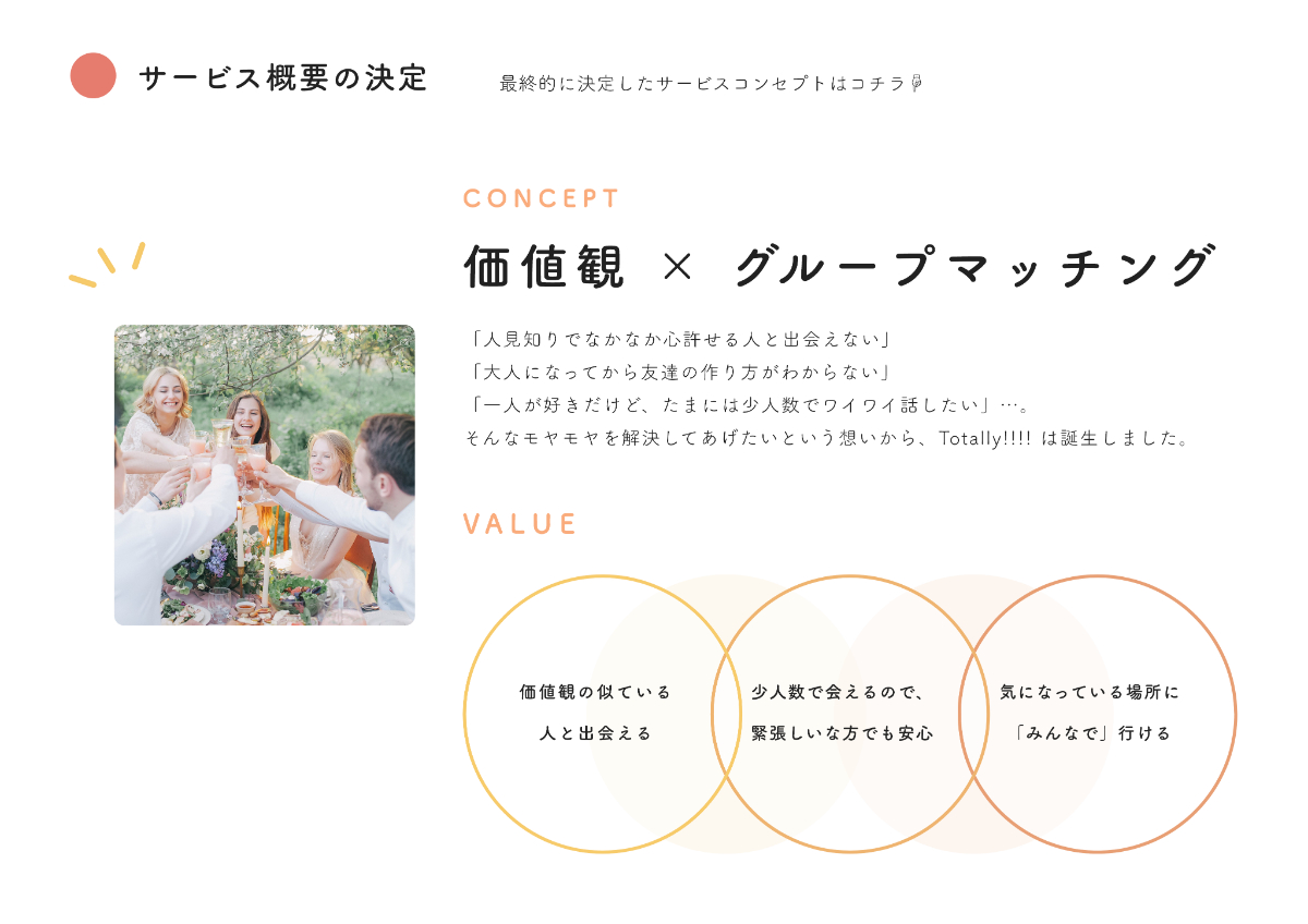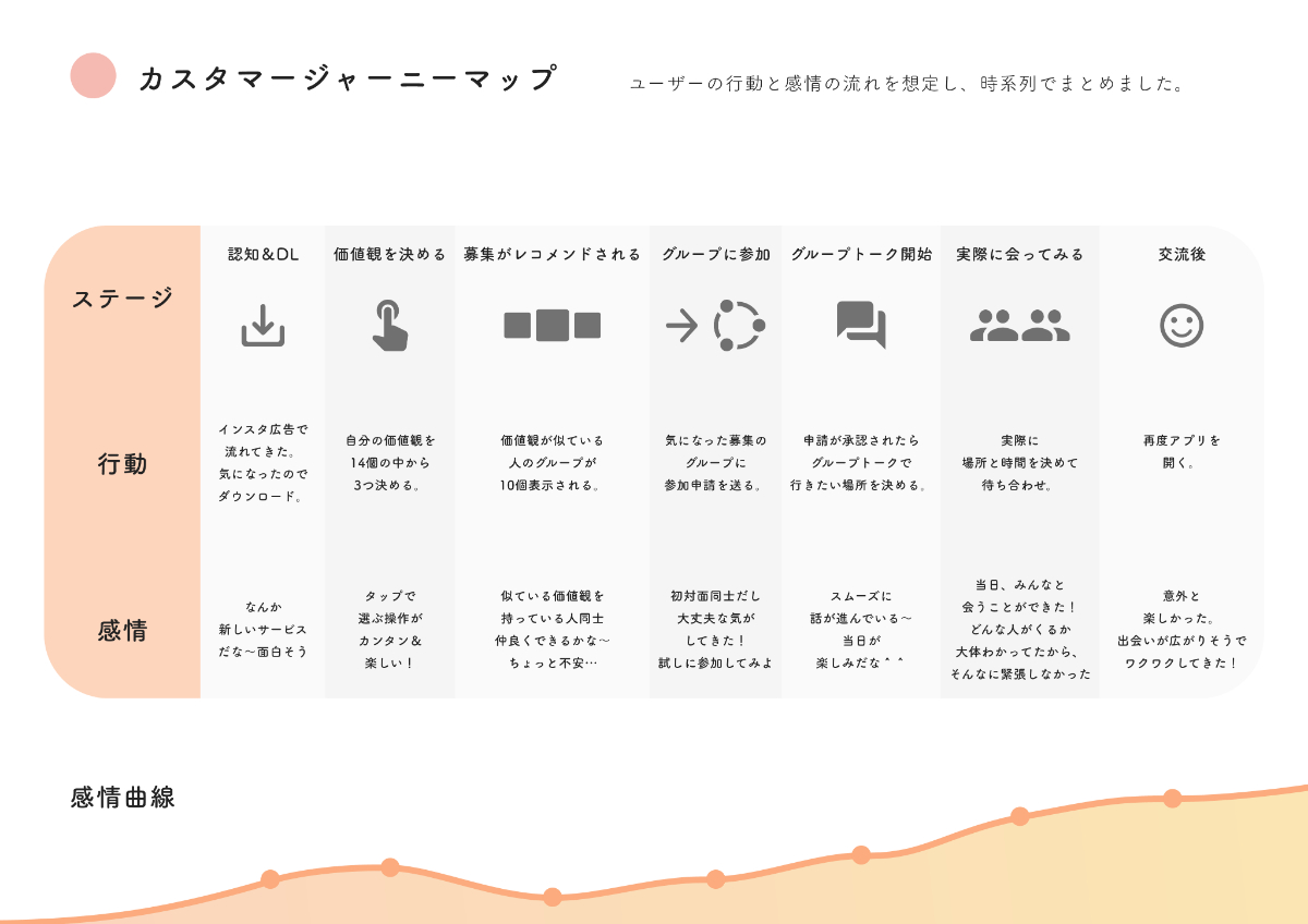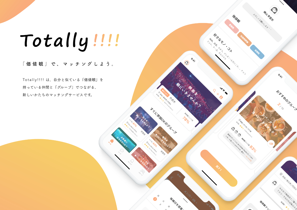 グループマッチングアプリ Totally!!!!(制作プロセス紹介) ミユキ 大学3年生(21卒) OVERVIEW 「価値観が似ている人同士の友達グループマッチングアプリ」のUX/UIデザイン YEAR 2019 - 2019 概要株式会社ビビビットが主催する「ビビビット展」に出展するために作成しました。作品詳細はこちら → 作品詳細プロトタイプはこちら → プロトタイプ作成の流れUIフロー図(拡大版)はこちら → UIフロー図 WEBSITE