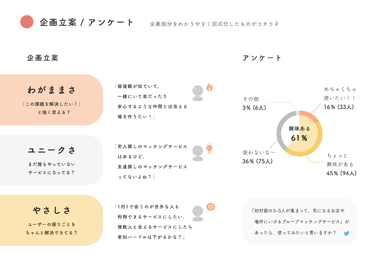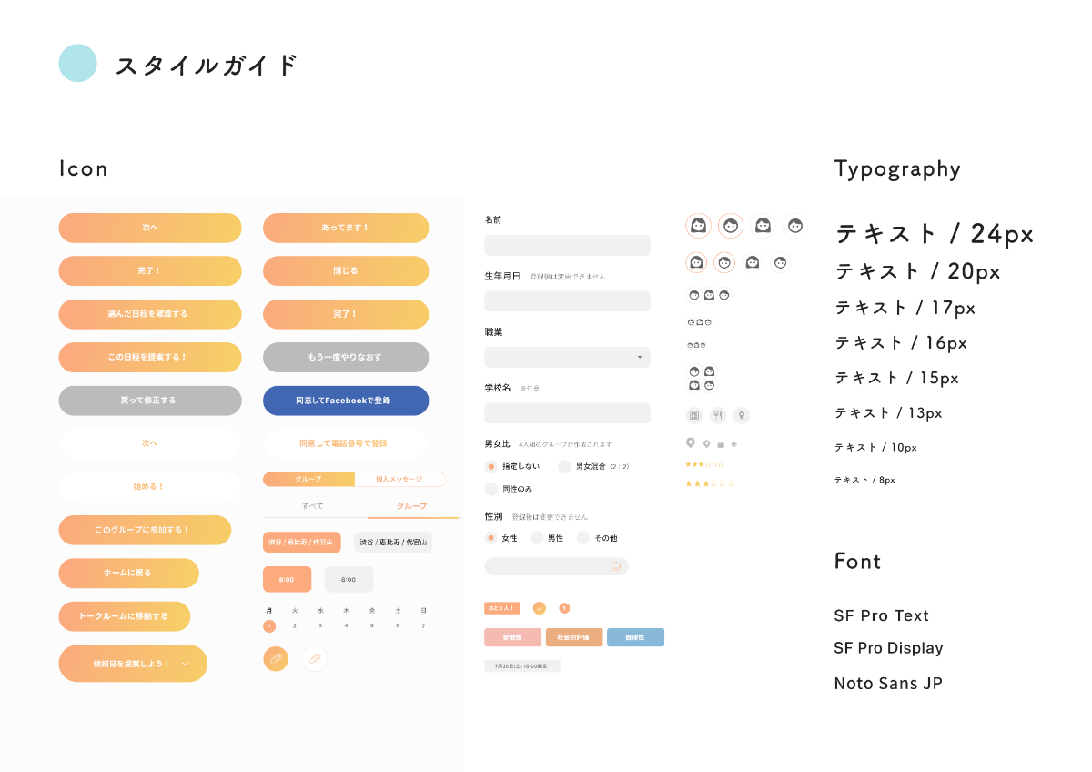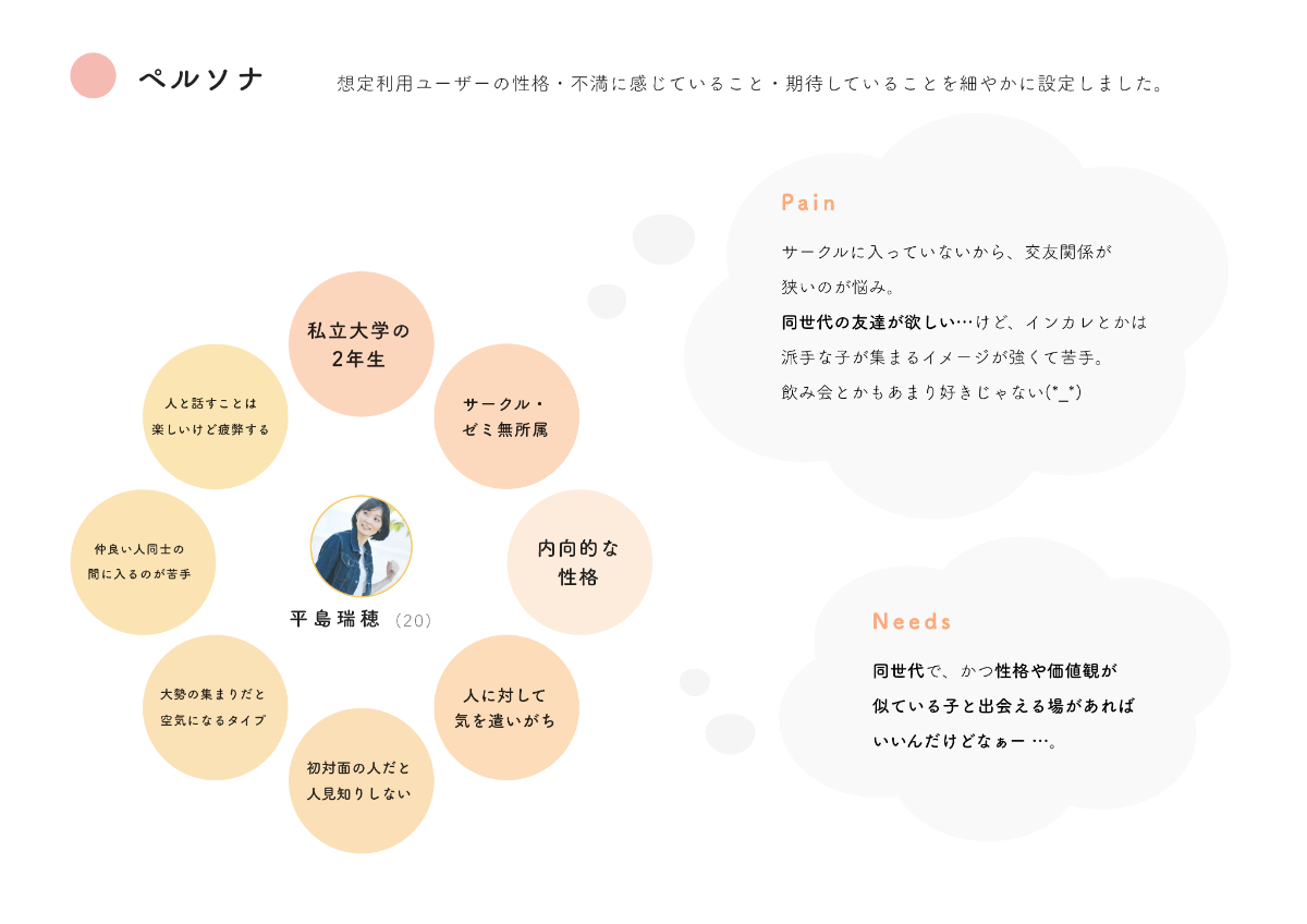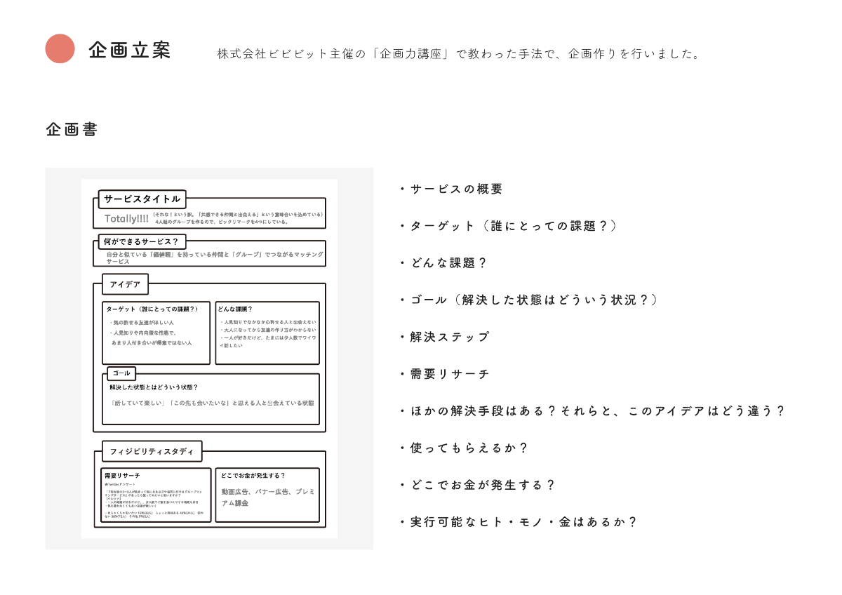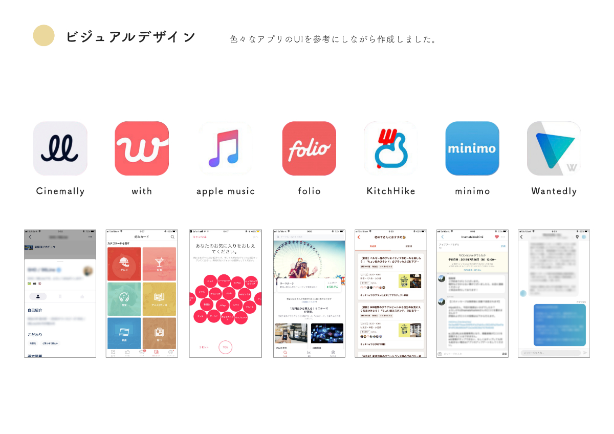 グループマッチングアプリ Totally!!!!(制作プロセス紹介) ミユキ 大学3年生(21卒) OVERVIEW 「価値観が似ている人同士の友達グループマッチングアプリ」のUX/UIデザイン YEAR 2019 - 2019 概要株式会社ビビビットが主催する「ビビビット展」に出展するために作成しました。作品詳細はこちら → 作品詳細プロトタイプはこちら → プロトタイプ作成の流れUIフロー図(拡大版)はこちら → UIフロー図 WEBSITE