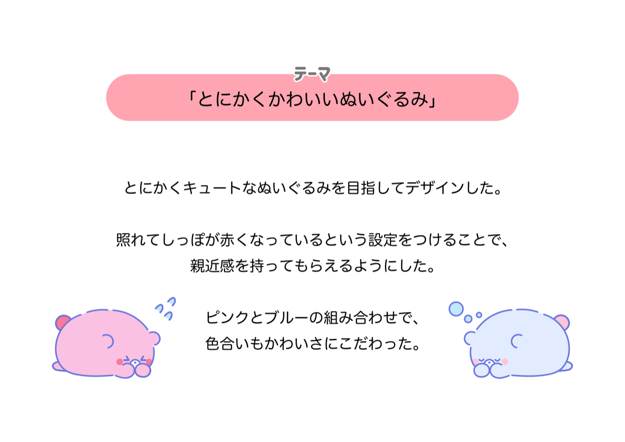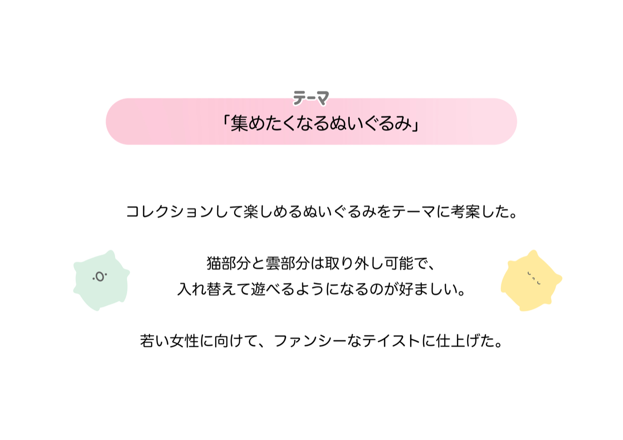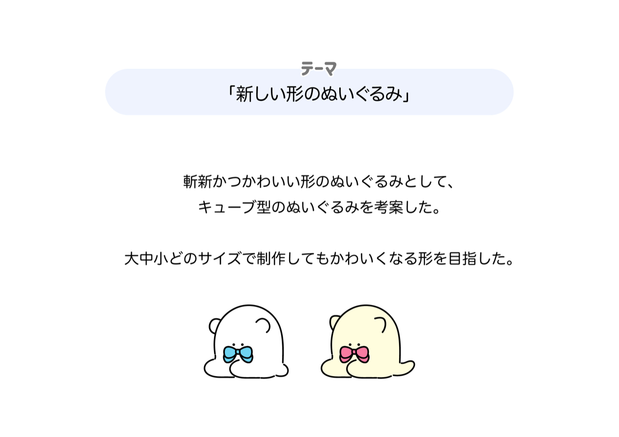 【キャラクター】ぬいぐるみ企画 Nae イラストレーター、デザイナー OVERVIEW ぬいぐるみの企画・デザインの紹介です。 ごろにゃ〜あしたてんきになあれくもとねこキューブアニマルTERE TERE KUMASANしろとくろ様々なテイストのぬいぐるみ企画・デザインを承っています。一度ご相談ください!